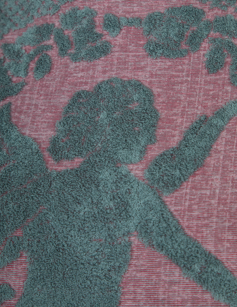 - Soft, textured french terrycloth cotton in light teal, pink, and red.