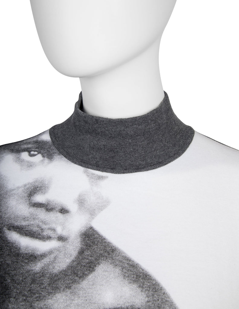 - Pictorial graphic print shirt featuring a very young Cassius Clay in a pixelated black grain on white.