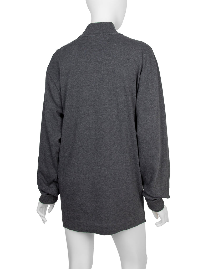 - Contrasting charcoal grey sleeves, back, and mock neck.