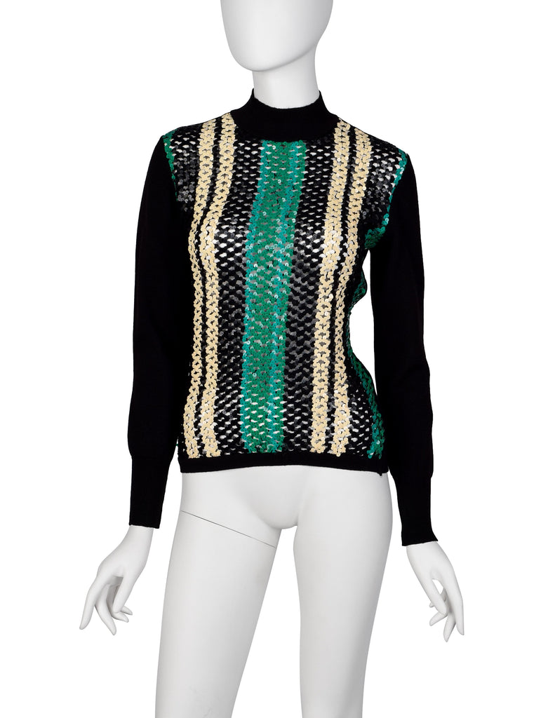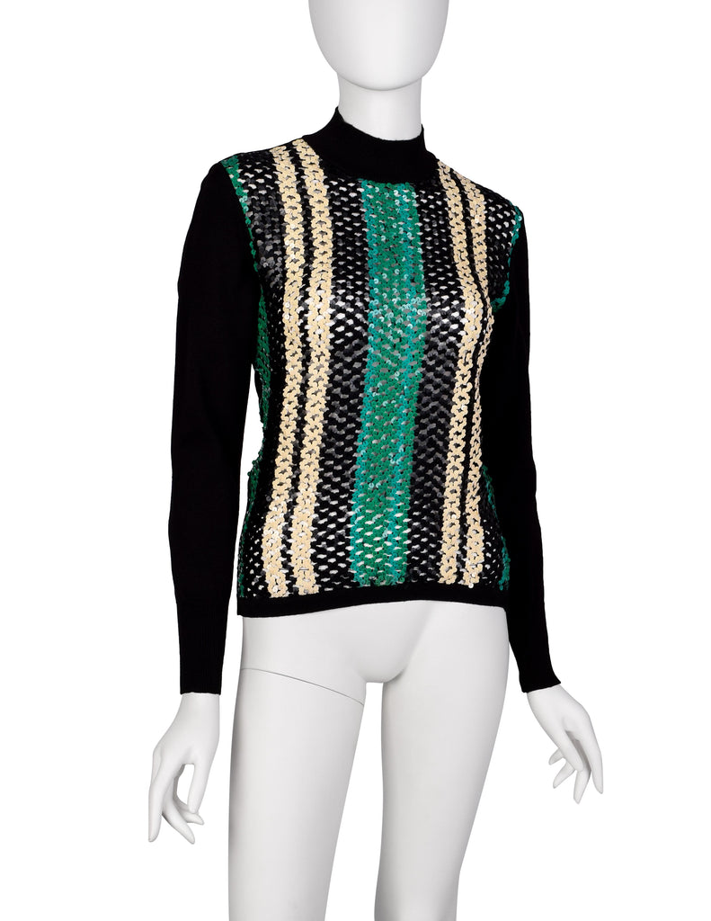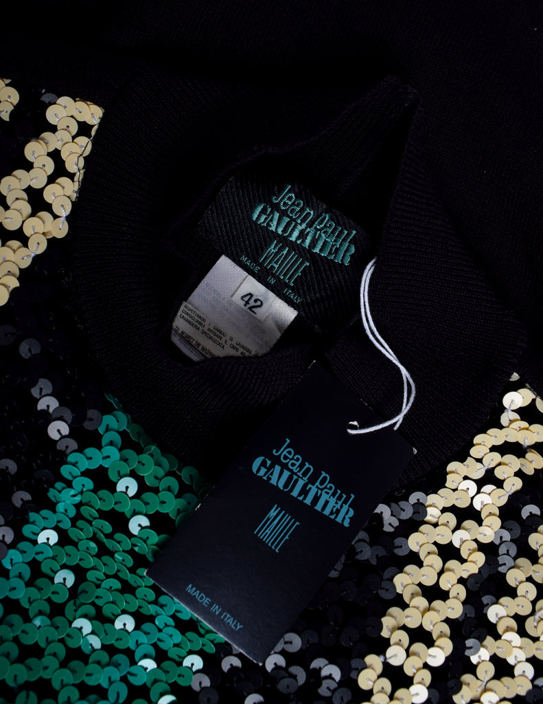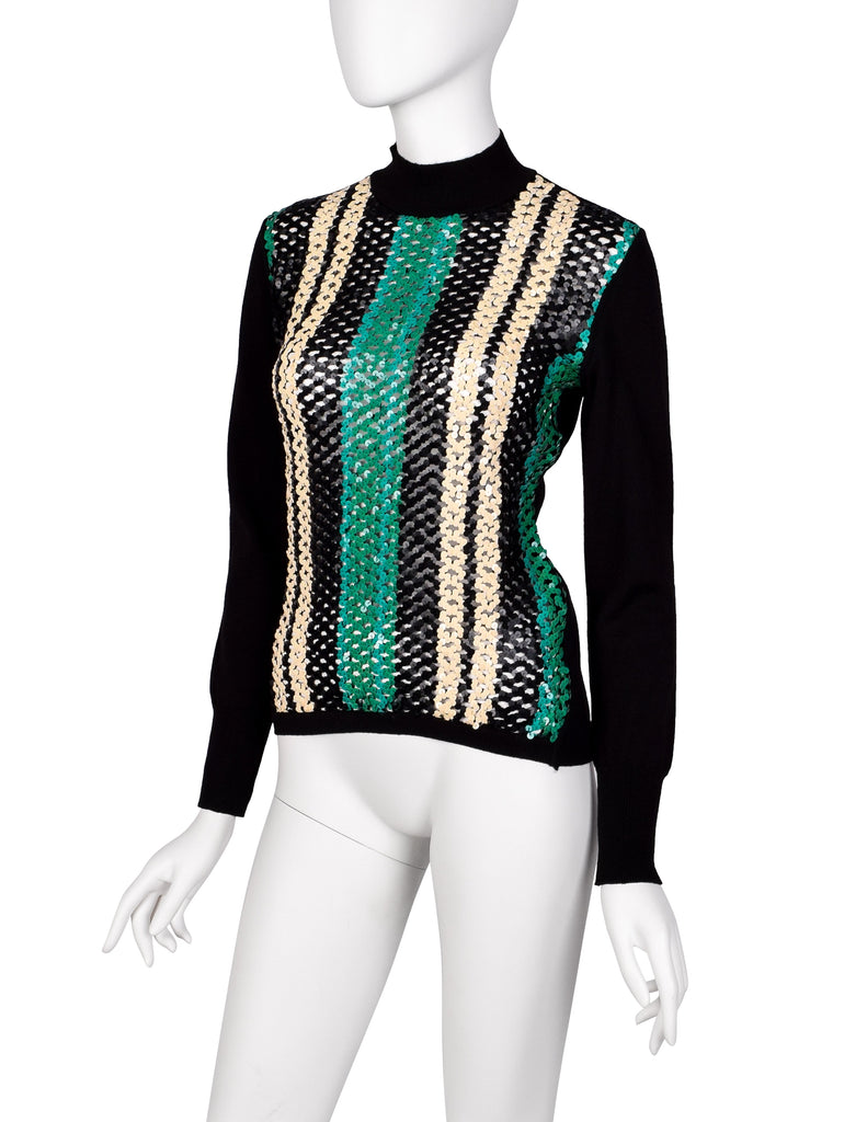 Adorable vintage Jean Paul Gaultier sweater from Fall/Winter 1991, a similar sequin piece shown here on the runway. This fantastic sweater features sequins in stripes of green, black, and baby banana yellow, in a stretch grid net that is see-through between. Solid black knit sleeves, trims, backside, and mock neck. Never worn with original tags attached.