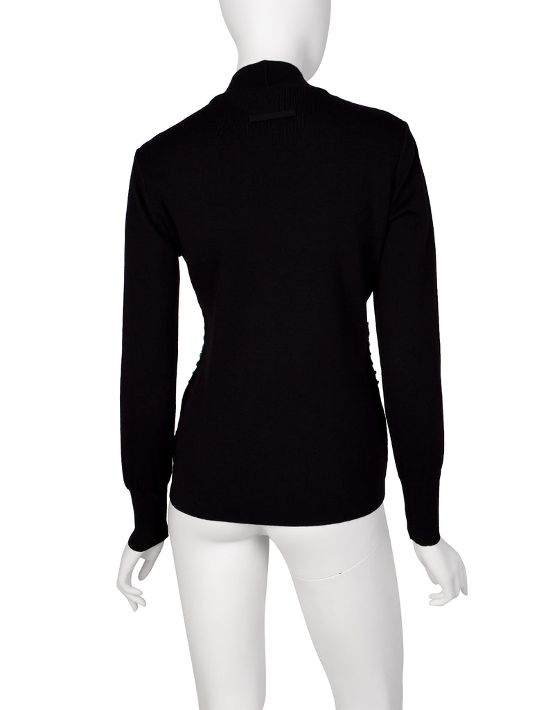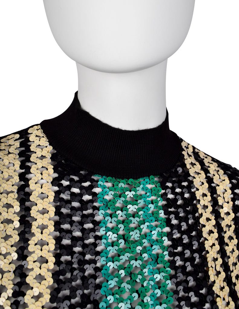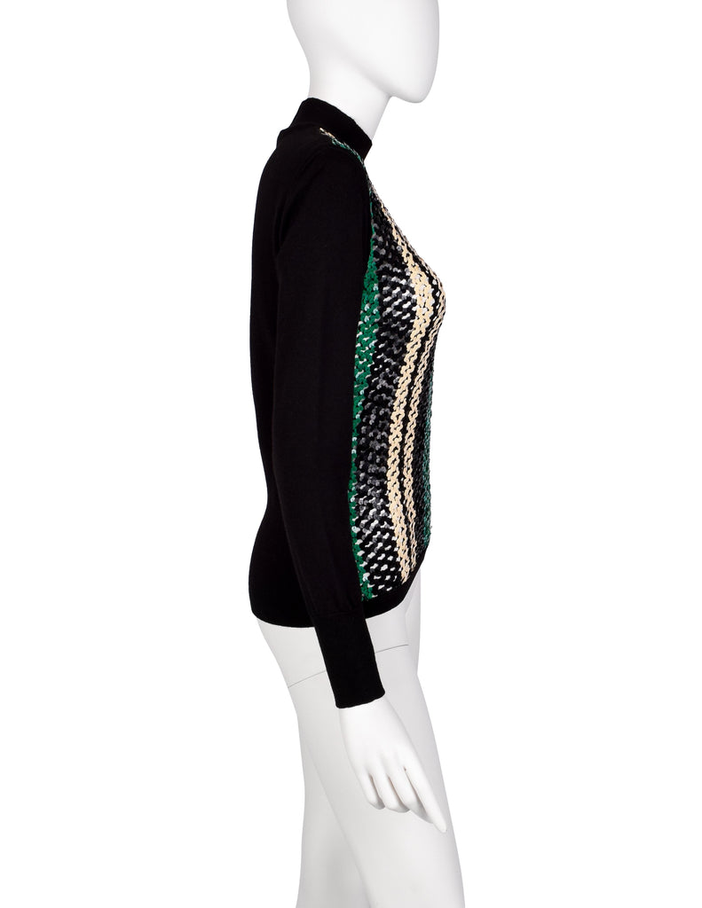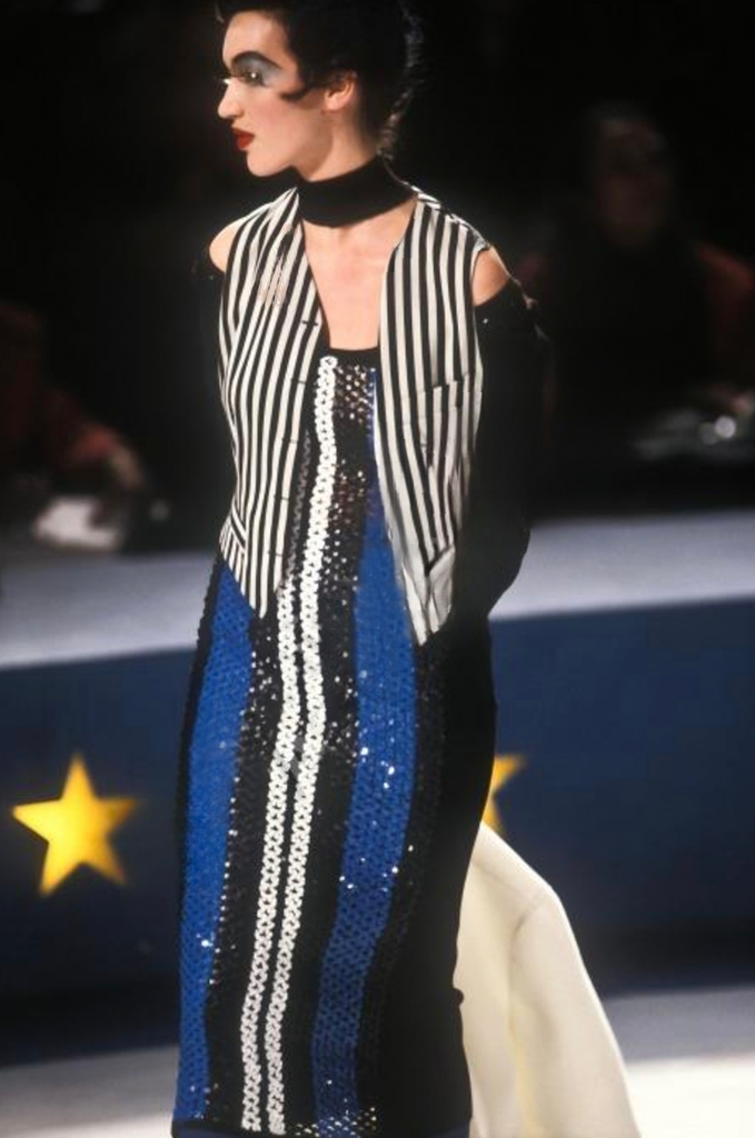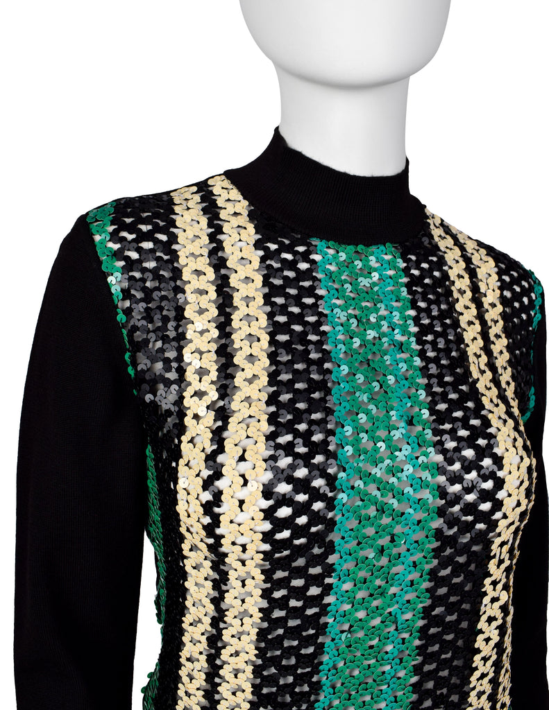 Adorable vintage Jean Paul Gaultier sweater from Fall/Winter 1991, a similar sequin piece shown here on the runway. This fantastic sweater features sequins in stripes of green, black, and baby banana yellow, in a stretch grid net that is see-through between. Solid black knit sleeves, trims, backside, and mock neck. Never worn with original tags attached.