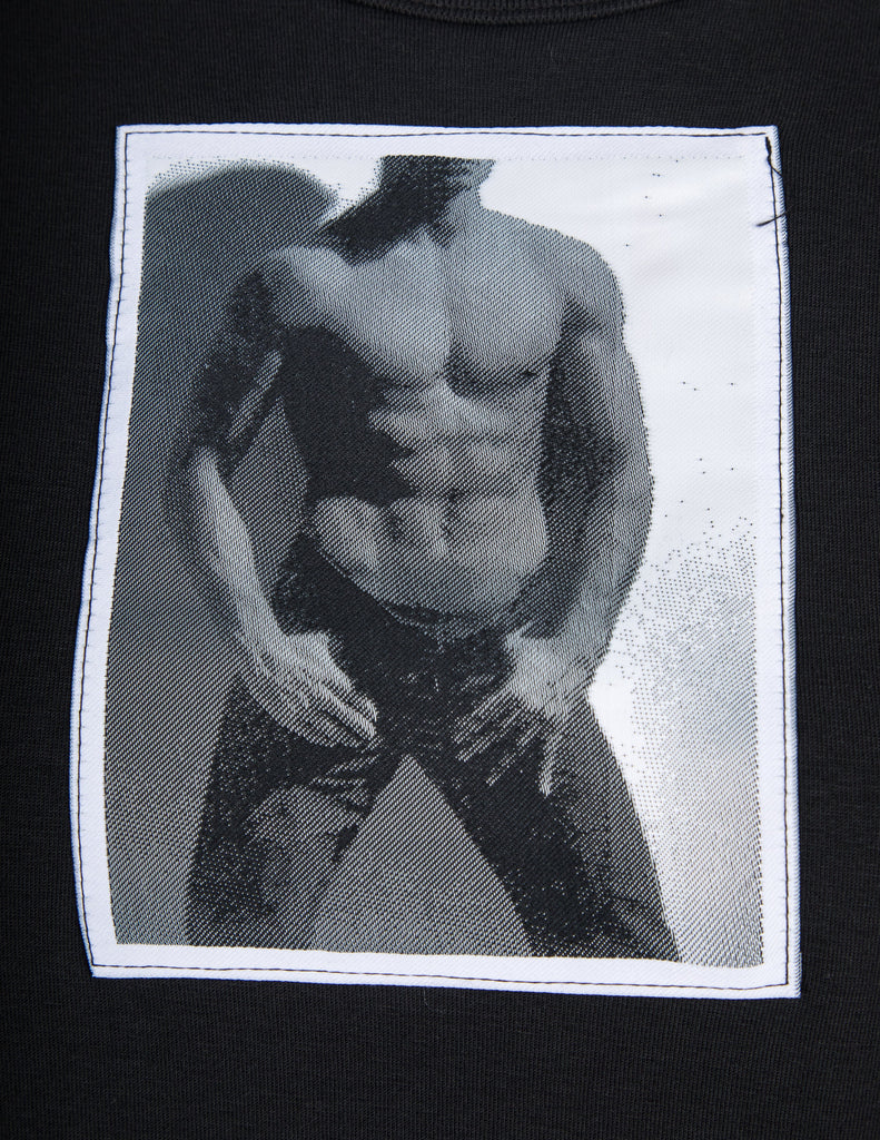 - Incredible patch featuring a men's body pixelated pictorial print in black and white, stitched at the front center.