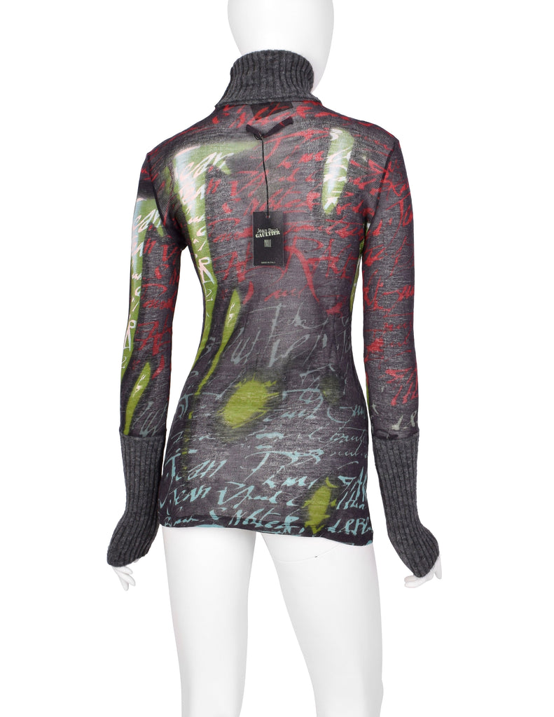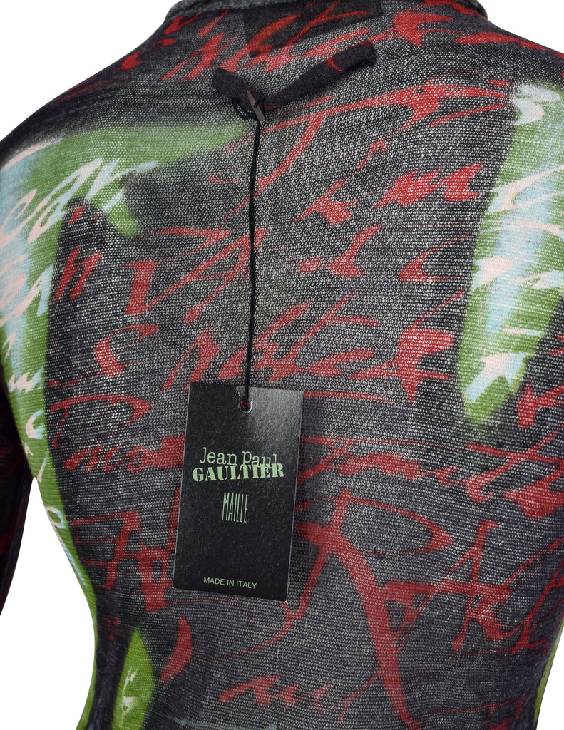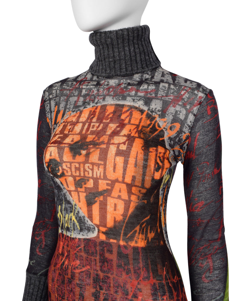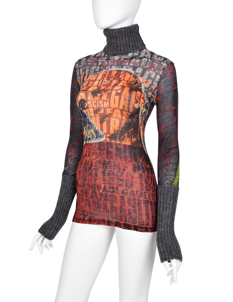Insane vintage Jean Paul Gaultier top from the Fall/Winter 1997 'Fight Racism' collection. A stunning color palette featuring a bold image covered in anti-racism and anti-fascism words and text. Stretch wool mesh blend, semi-sheer. Soft, fuzzy wool turtleneck and wide cuffs. Original tag still attached, this piece has never been worn.