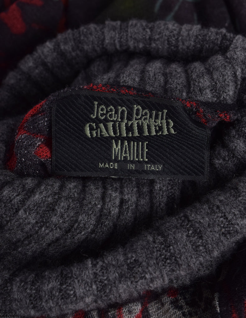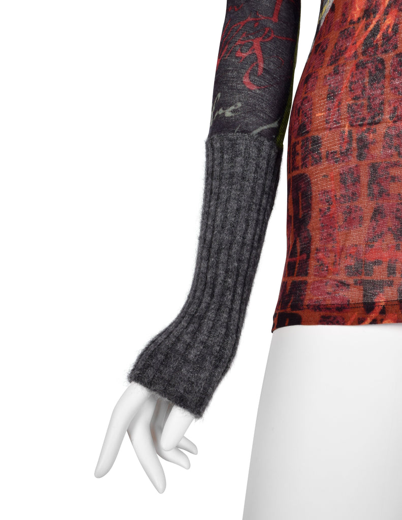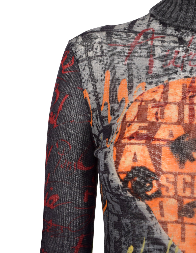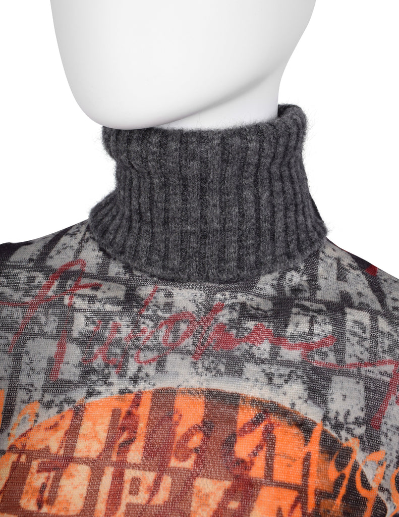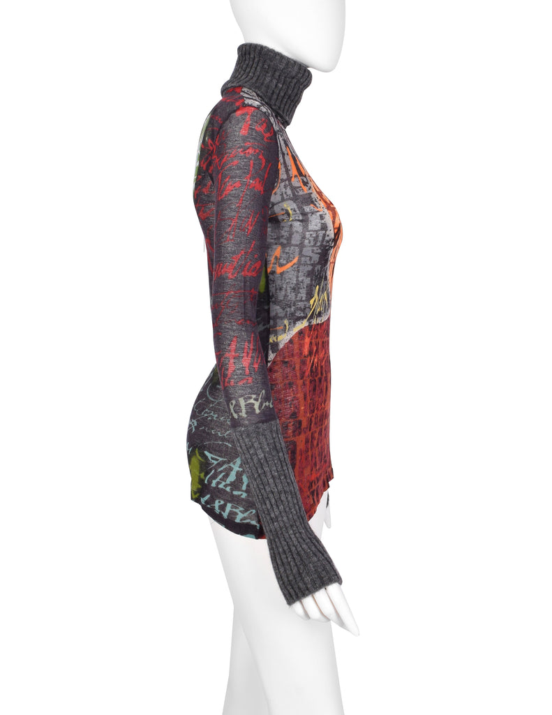 Insane vintage Jean Paul Gaultier top from the Fall/Winter 1997 'Fight Racism' collection. A stunning color palette featuring a bold image covered in anti-racism and anti-fascism words and text. Stretch wool mesh blend, semi-sheer. Soft, fuzzy wool turtleneck and wide cuffs. Original tag still attached, this piece has never been worn.