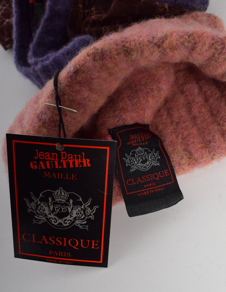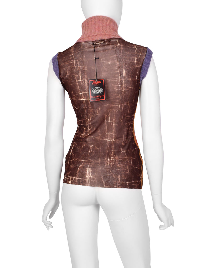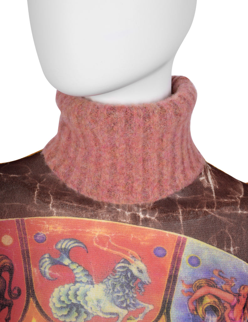 Magical vintage Jean Paul Gaultier (Classique) top from Fall/Winter 1999. Multicolor semi-sheer stretch mesh featuring an insanely cool zodiac print at the front side. Dusty rose pink ribbed soft fuzzy wool turtleneck collar, with purple trim of the same composition at each arm. Matching fuzzy wool overlock stitching at sides. Original tags still attached, this piece has never been worn!