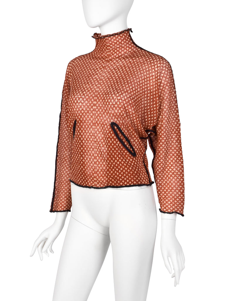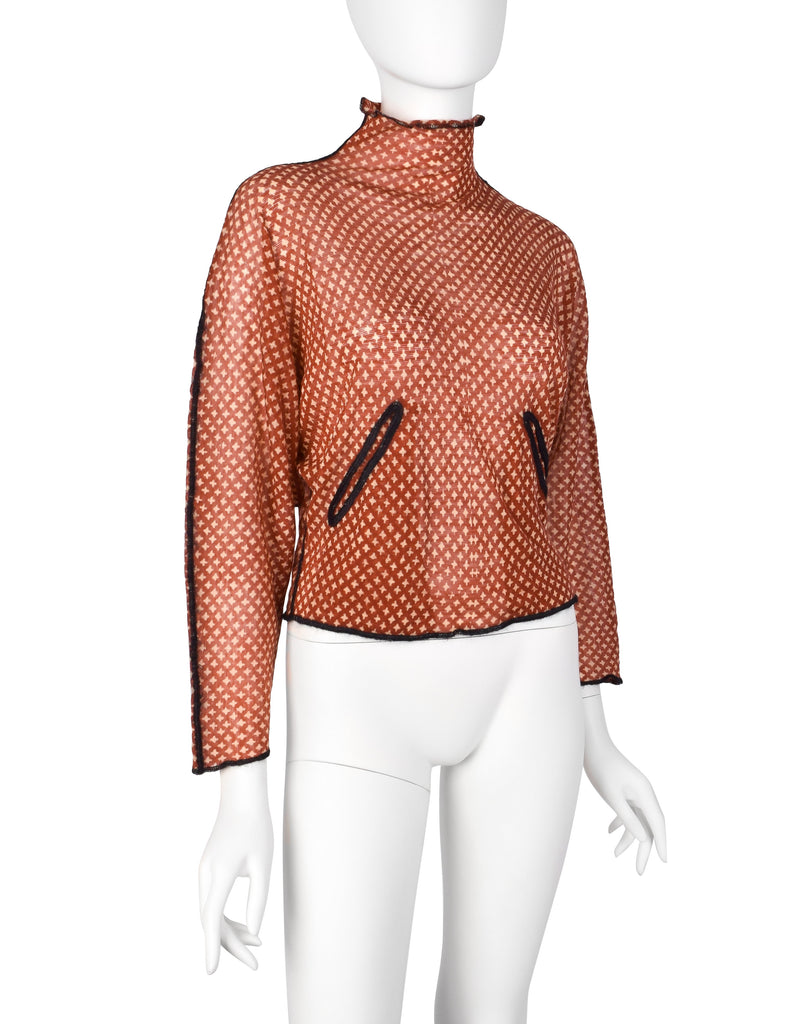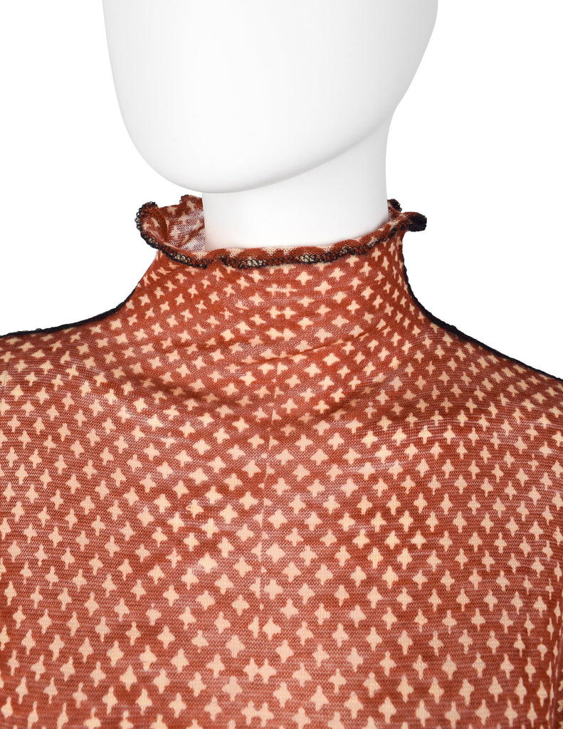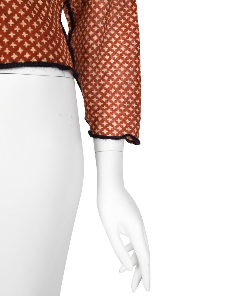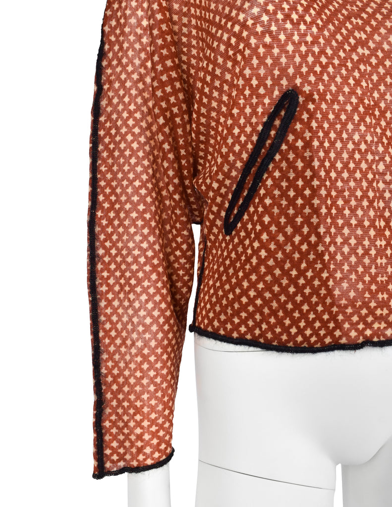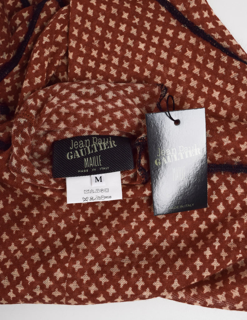 Stunning vintage Jean Paul Gaultier sweater from Fall/Winter 2000 (print shown here on other pieces in varying colors on the runway. Fuzzy, sheer wool in a brick red featuring a beige four point star print throughout. Cropped length with dolman sleeves. Slit pockets at front. Contrasting black seams. Original tag still attached, this item has never been worn.