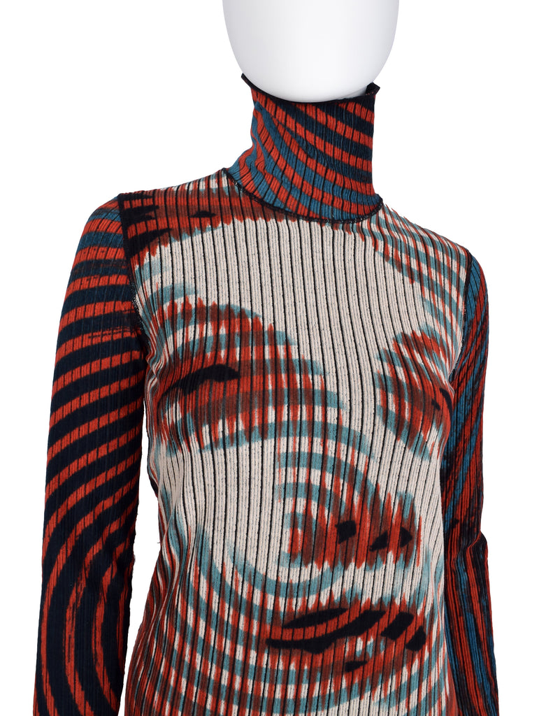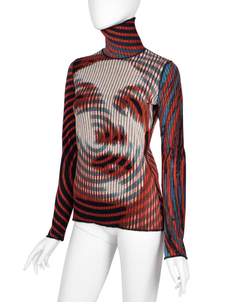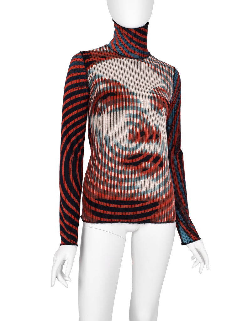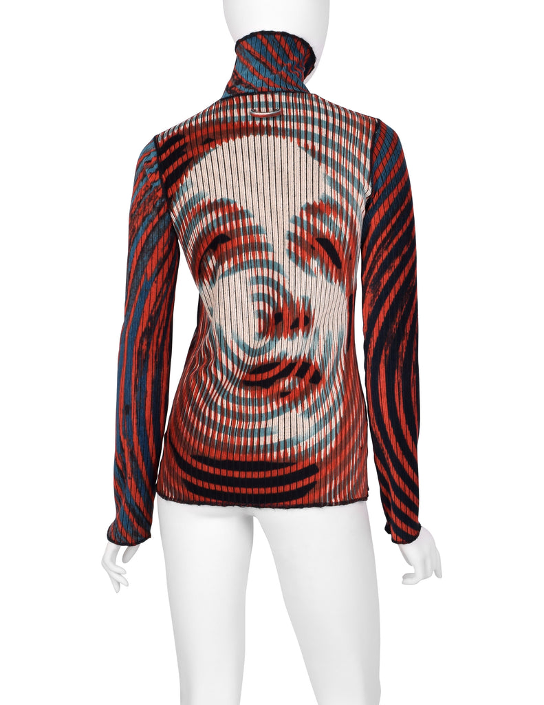 Incredible vintage Jean Paul Gaultier top from Fall/Winter 2001. This highly sought after design features an optic print of Greta Garbo in shades off off-white, red, blue, and black. A light to medium-weight stretch, ribbed knit, with a high collar and long sleeves. An amazing alternative to the typical sheer mesh. The cotton blend makes it suitable for year-round wear.