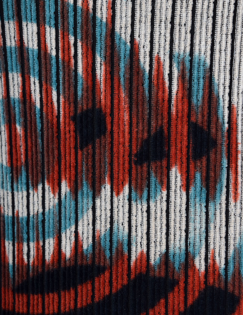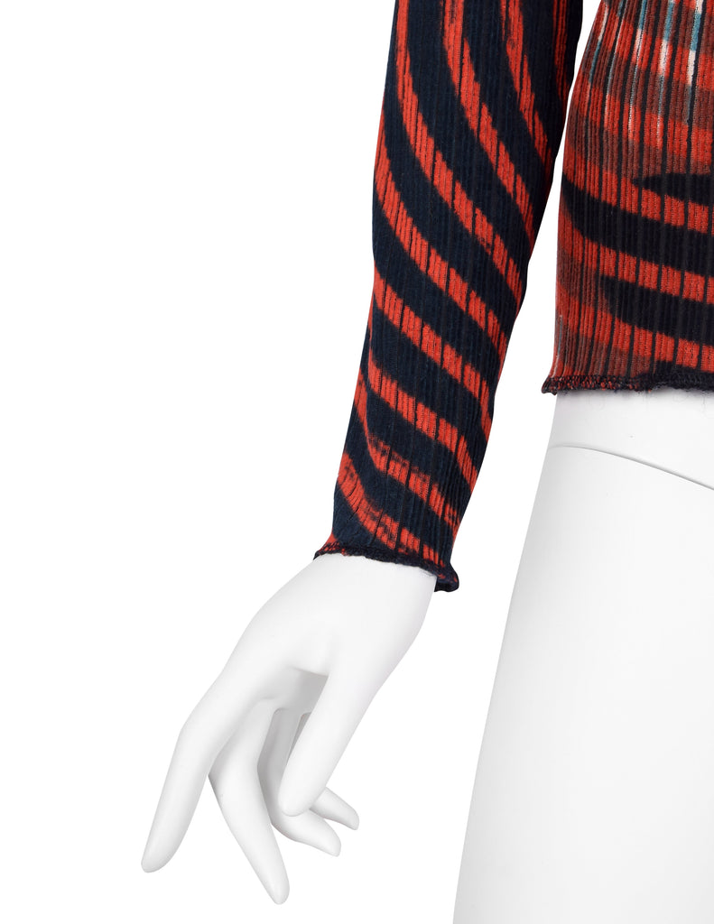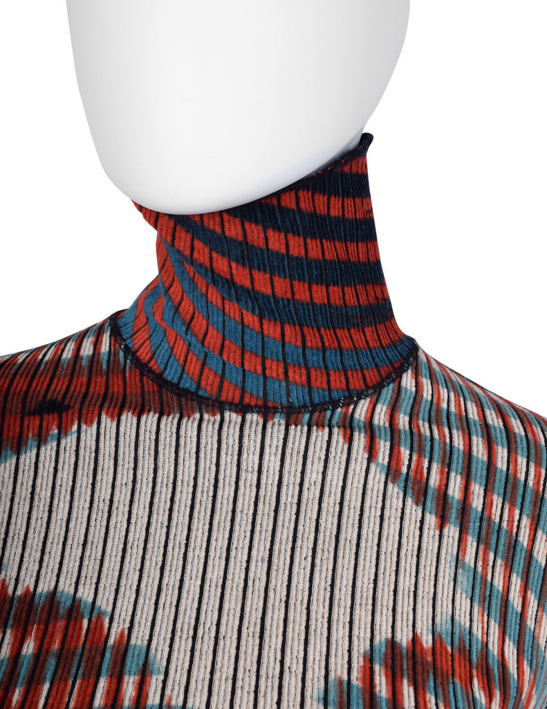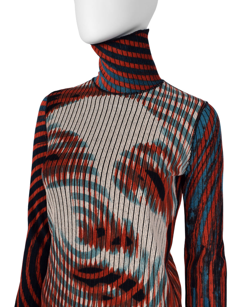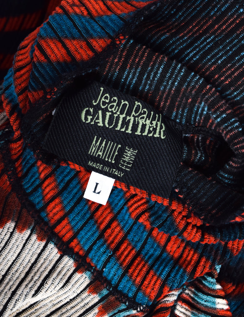 Incredible vintage Jean Paul Gaultier top from Fall/Winter 2001. This highly sought after design features an optic print of Greta Garbo in shades off off-white, red, blue, and black. A light to medium-weight stretch, ribbed knit, with a high collar and long sleeves. An amazing alternative to the typical sheer mesh. The cotton blend makes it suitable for year-round wear.