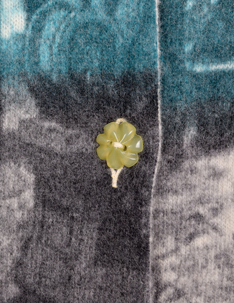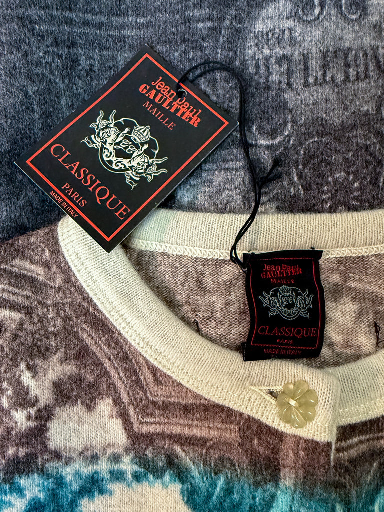Adorable vintage Jean Paul Gaultier vintage cardigan from Spring/Summer 1998. Brown, grey, teal, and cream detailed scenic French courtyard print on a knit fuzzy wool (some stretch). Cutest carved yellow flower button closure at front. Original tag attached, never worn.