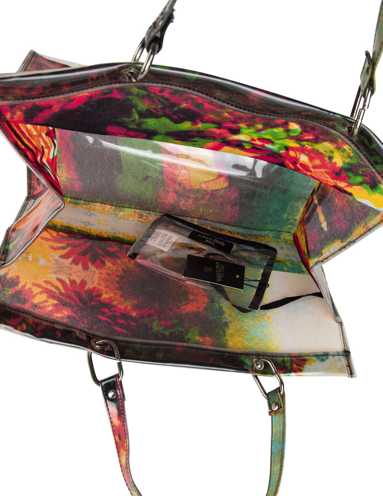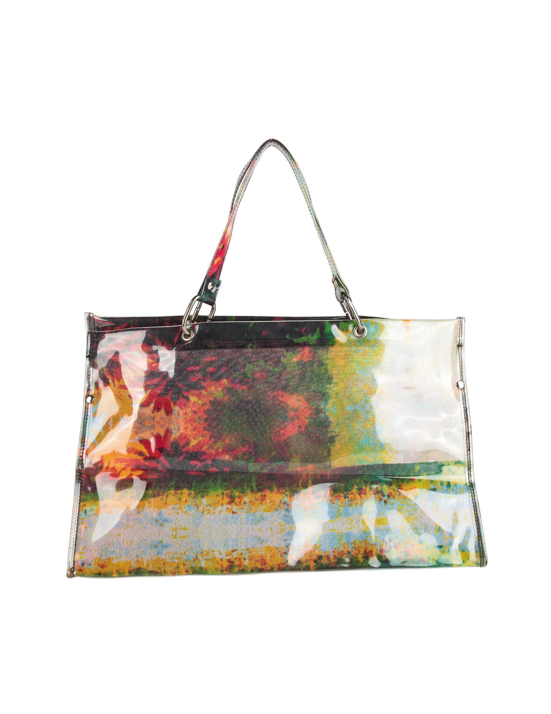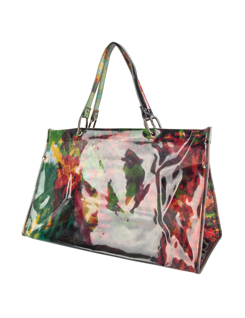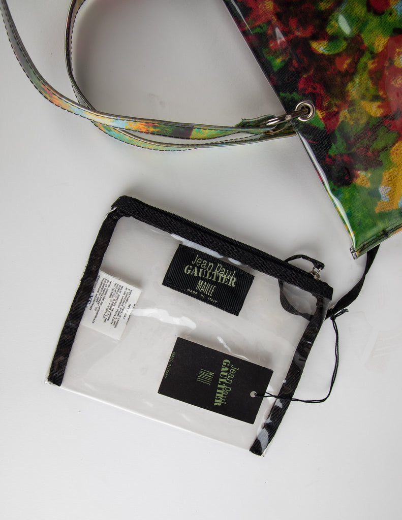 Out of this world vintage Jean Paul Gaultier bag from the Spring/Summer 2000 'Love Boat' Collection. This extremely rare tote bag features a vibrant, Tahitian print mesh encased in clear vinyl. Spacious interior with attached clear zip bag for Small items. Original tag still attached, this bag has never been used.