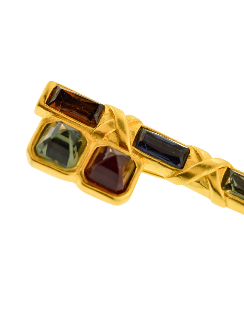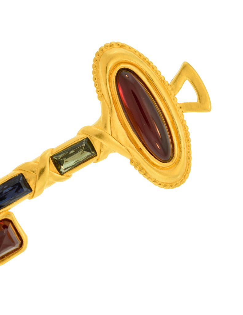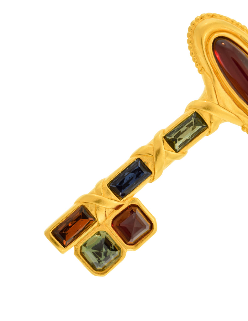 Gorgeous and fun vintage Karl Lagerfeld brooch from the late 1980s/early 1990s. This phenomenal and rare key pin is sure to make a statement. Artisanal, brushed matte gold finish encrusted with a multicolor array of faceted glass gems and a red cabochon at the top Secure pin back closure, signed back side. This key will unlock your accessorizing dreams!