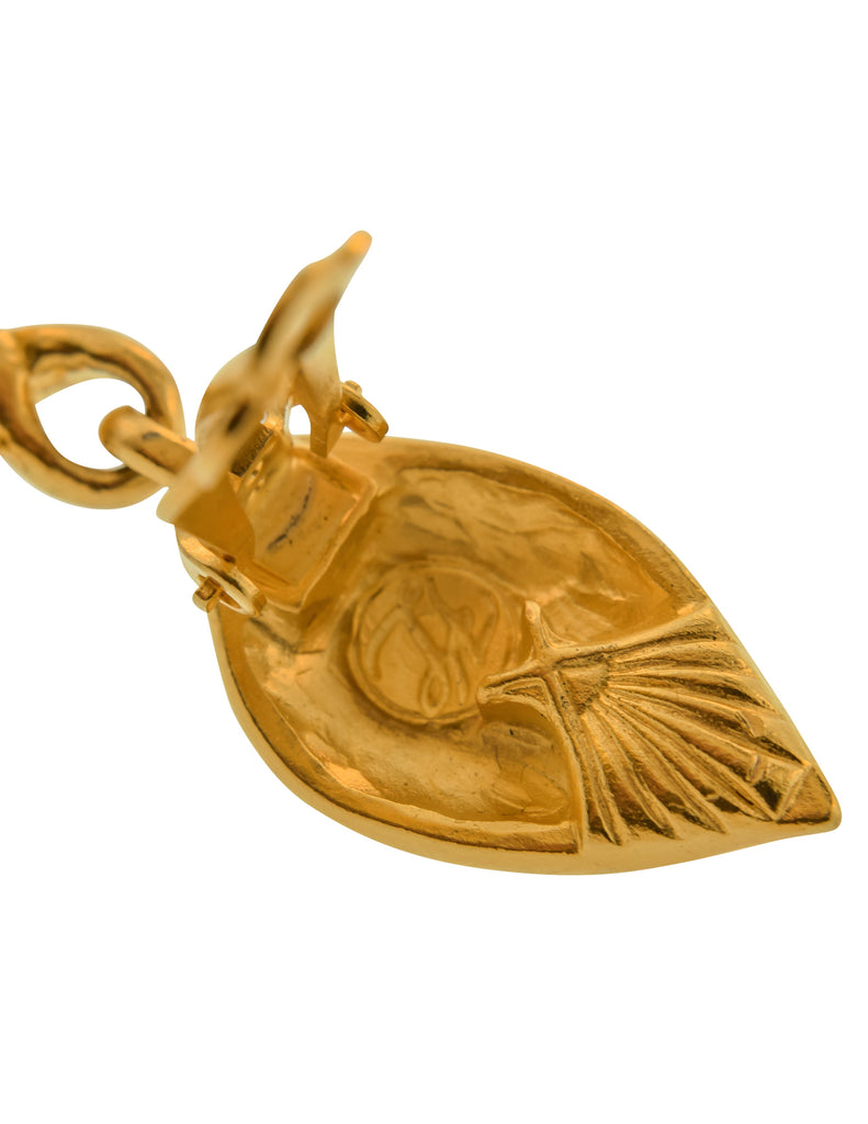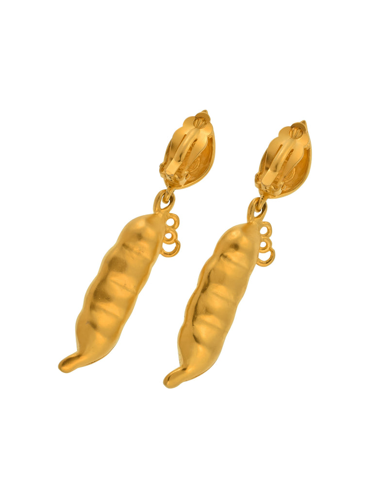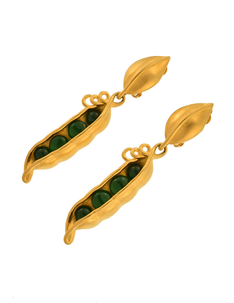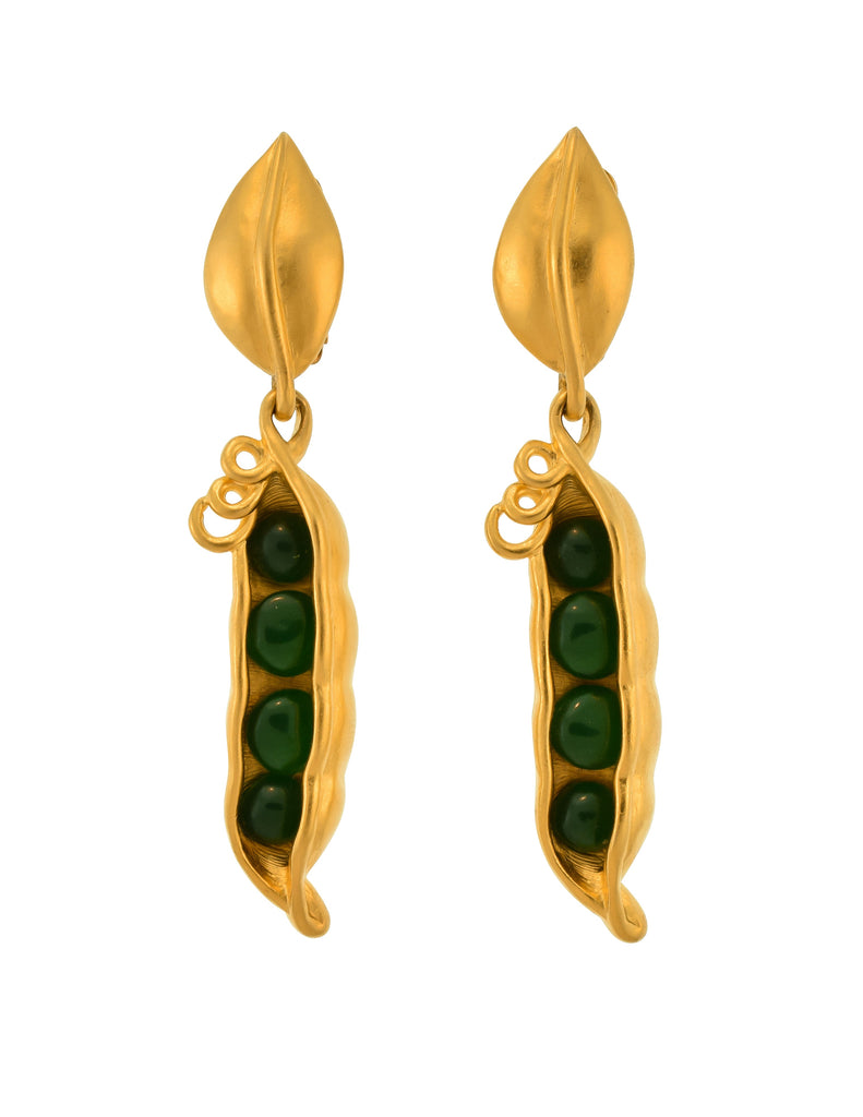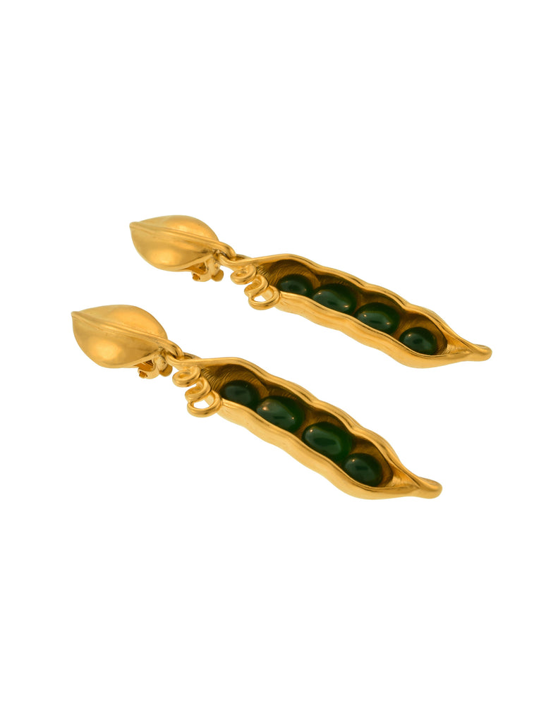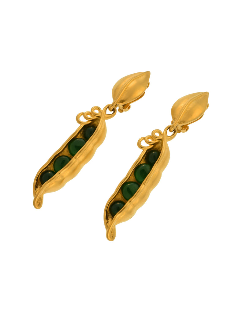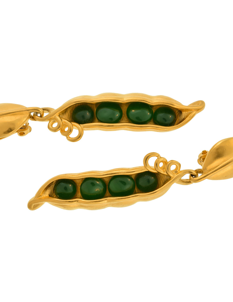 Out of this world ADORABLE vintage Karl Lagerfeld earrings from the early 1990s. Gold plated, artisanal brushed matte pea pod motif featuring green glass peas within, dangling from leaves. The little curly detail completes these fantastic, whimsical cuties. Signed backside. Clip on. A collectible treasure that will garner compliments whenever and wherever you wear them.