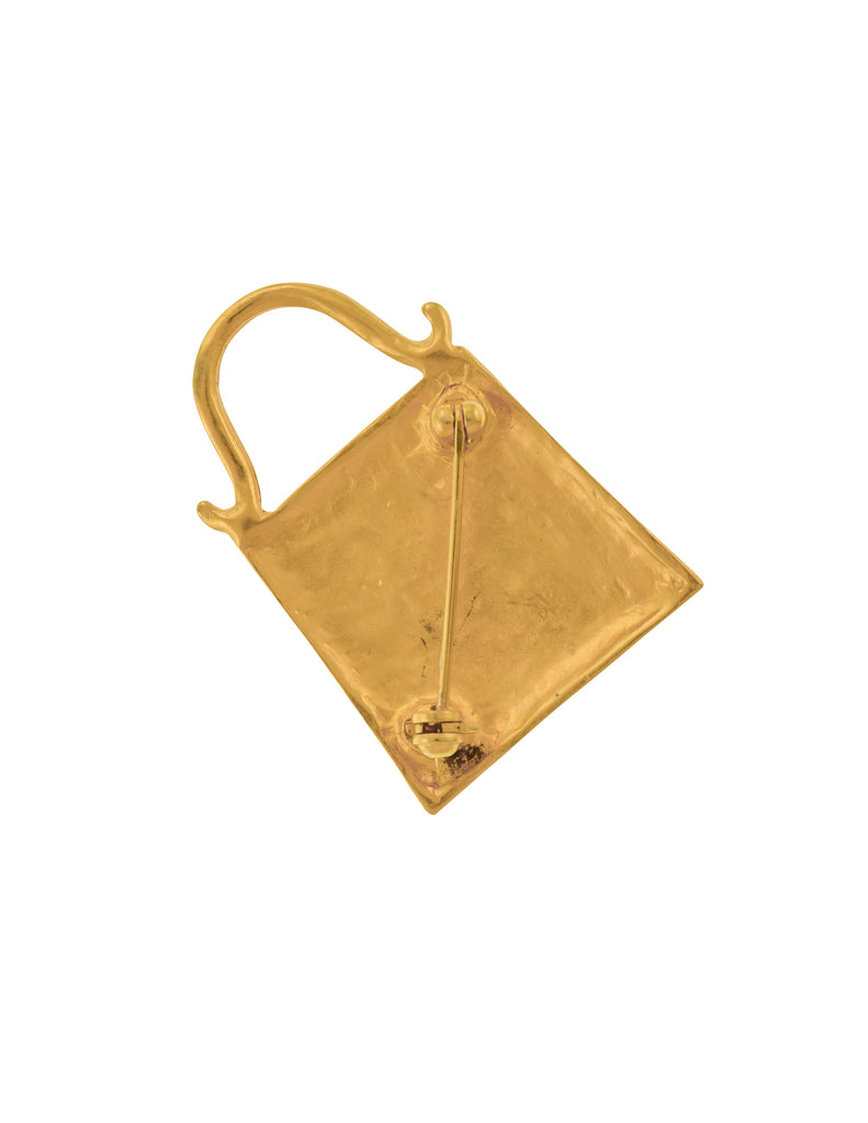 Adorable vintage Karl Lagerfeld brooch from the early 1990s. Sweetest top-handle handbag shape with KL logo at "flap". Gold plated artisanal satin finish, featuring ultra sparkly green rhinestones. Secure pin back closure.