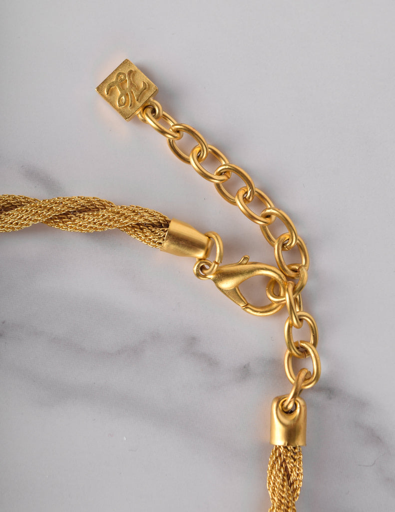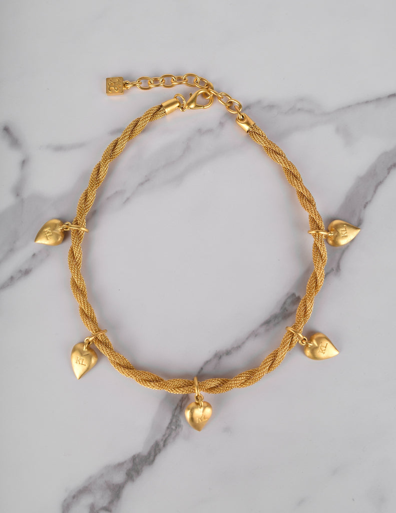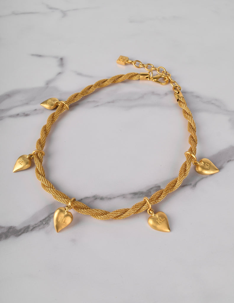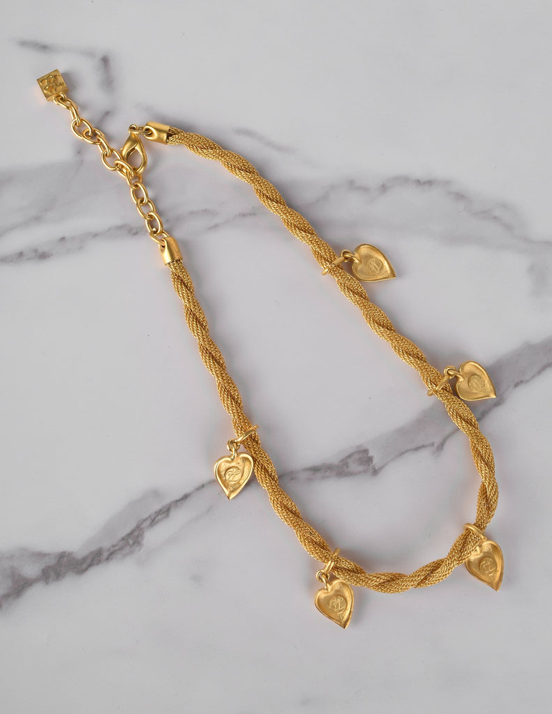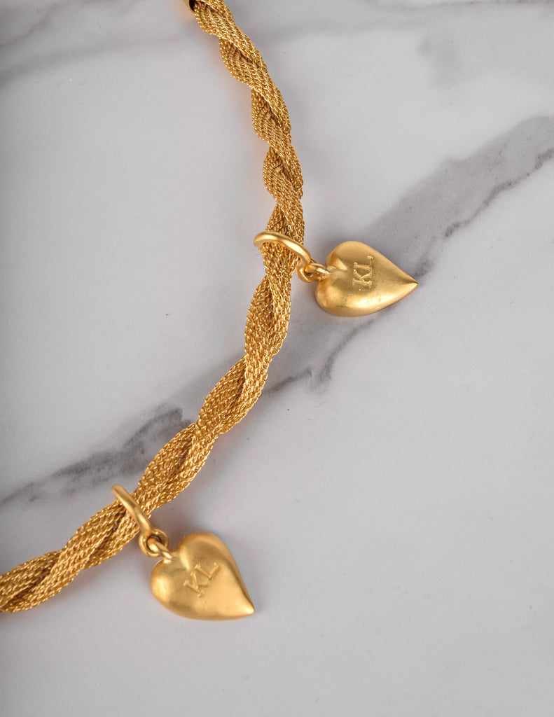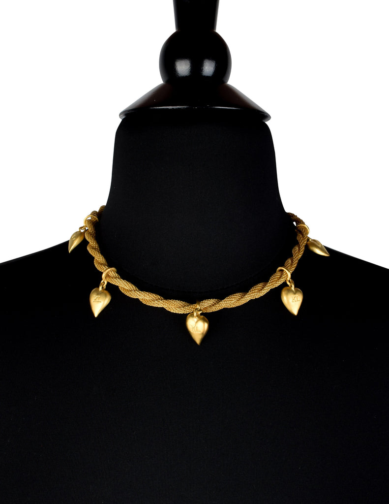 Lovely vintage Karl Lagerfeld necklace. Twisted mesh chain featuring five dangling, dainty heart charms, each etched with KL initials. Artisanal brushed matte gold plated finish. Clasp closure with adjustable length, the end adorned with a KL signature cartouche charm.