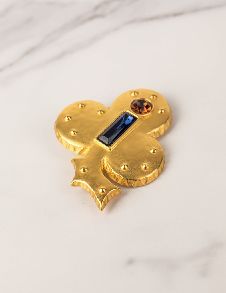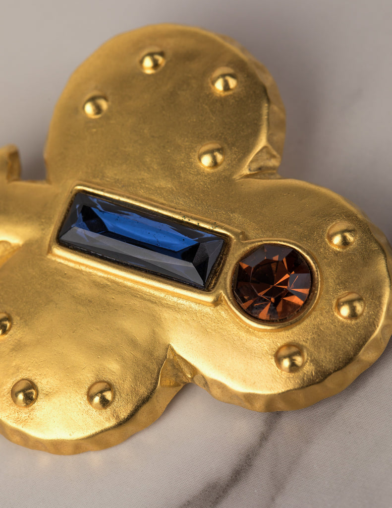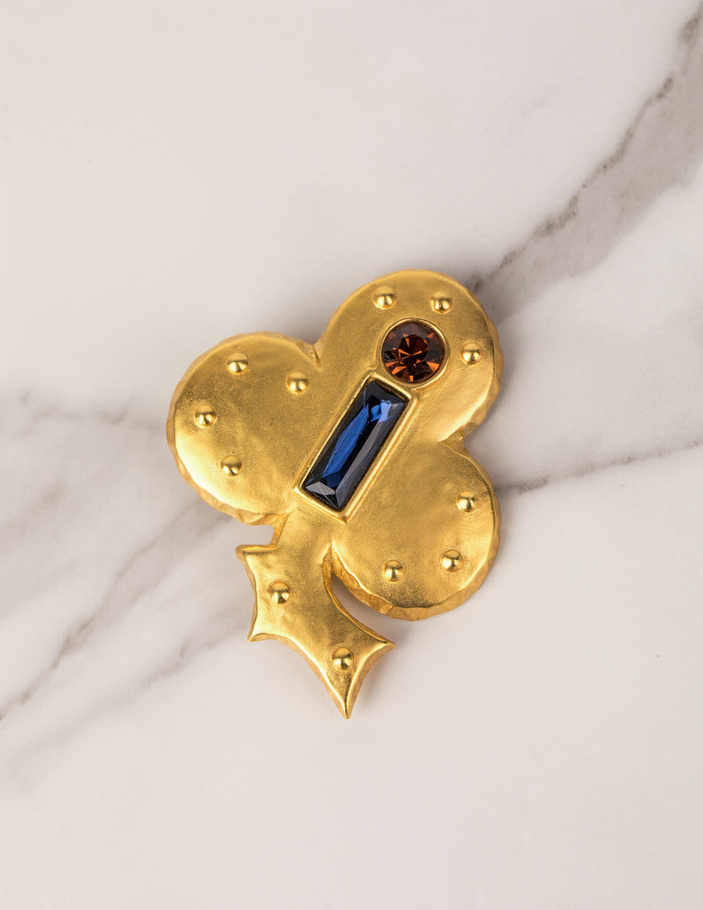 Rare and unique vintage Karl Lagerfeld brooch. Get lucky with this whimsical club card suit / clover shaped pin, featuring deep orange and gorgeous blue faceted crystals at the center. 24k gold plated satin finish, with artisanal touched and hammered details. Secure pin back closure. Signed back side.