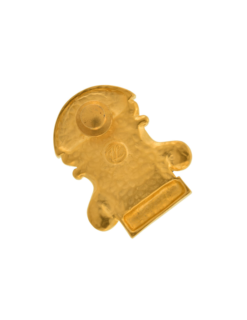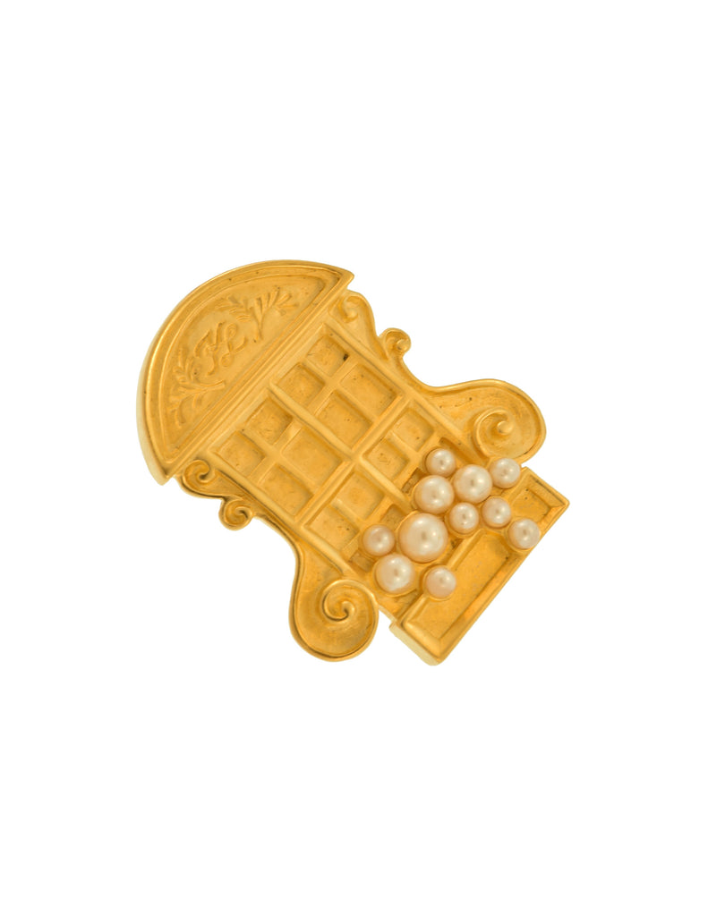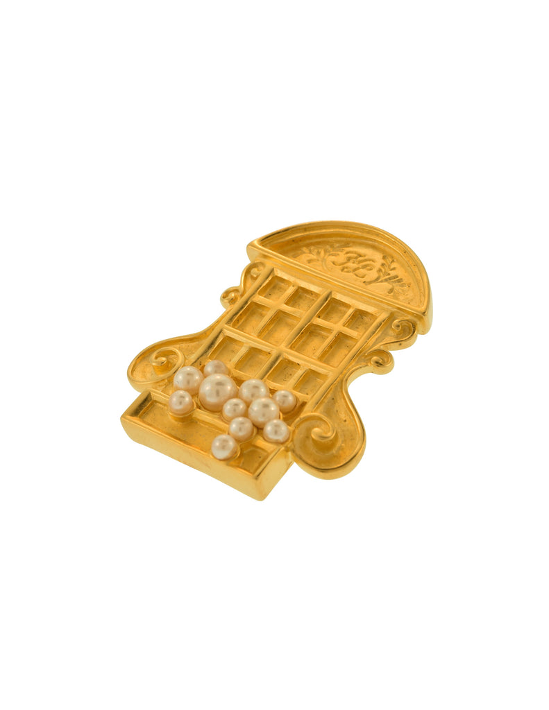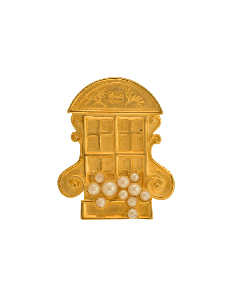 Wonderful and rare vintage Karl Lagerfeld pin from the early 1990s. Whimsical, window relief featuring KL initials at the arch. Cutest faux pearl adornments representing floral cascading from the sill. Artisanal, brushed matte gold plated finish. Secure, typical tack closure typically made for ties or lapels, but can certain adorn anything you'd want it to. KL signature at backside.