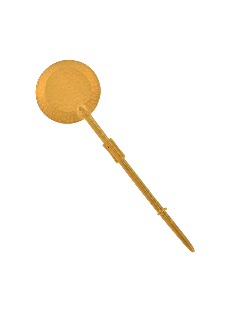 Striking and fun vintage Karl Lagerfeld brooch. Large, sceptre shaped pin featuring an a dinner plate at the top, detailed with a wreath and red enamel. Artisanal, matte, brushed gold plated finish. Classic KL signature and wreath etched at the center with black enamel within. Secure long pin back closure - wear it on the lapel of your favorite coat, jacket, or vest.