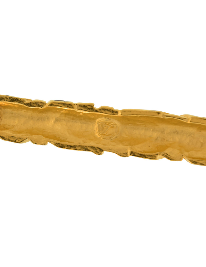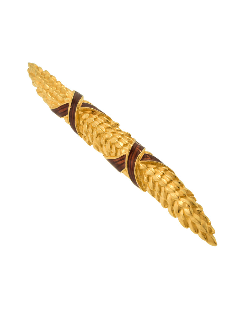 Lovely vintage Karl Lagerfeld brooch in an artisanal, brushed matte gold plated finish. Bundled wheat, bound with red enamel details. Large, statement size. Signed back. Secure pin closure.
