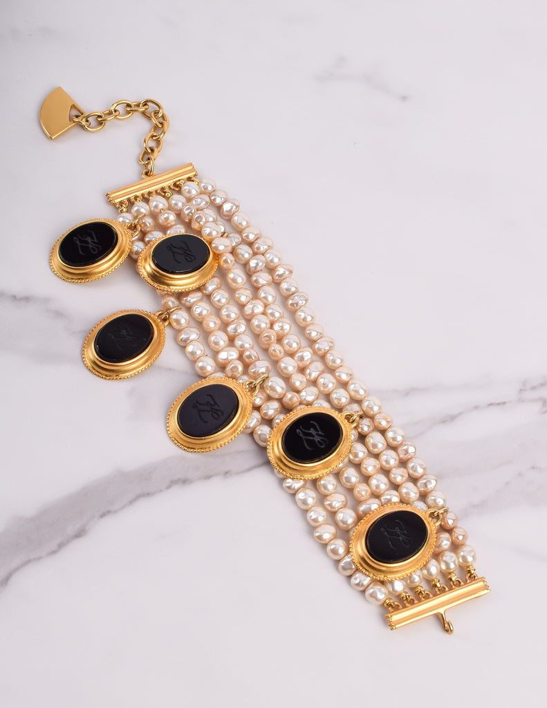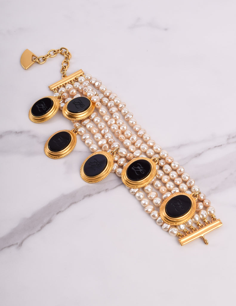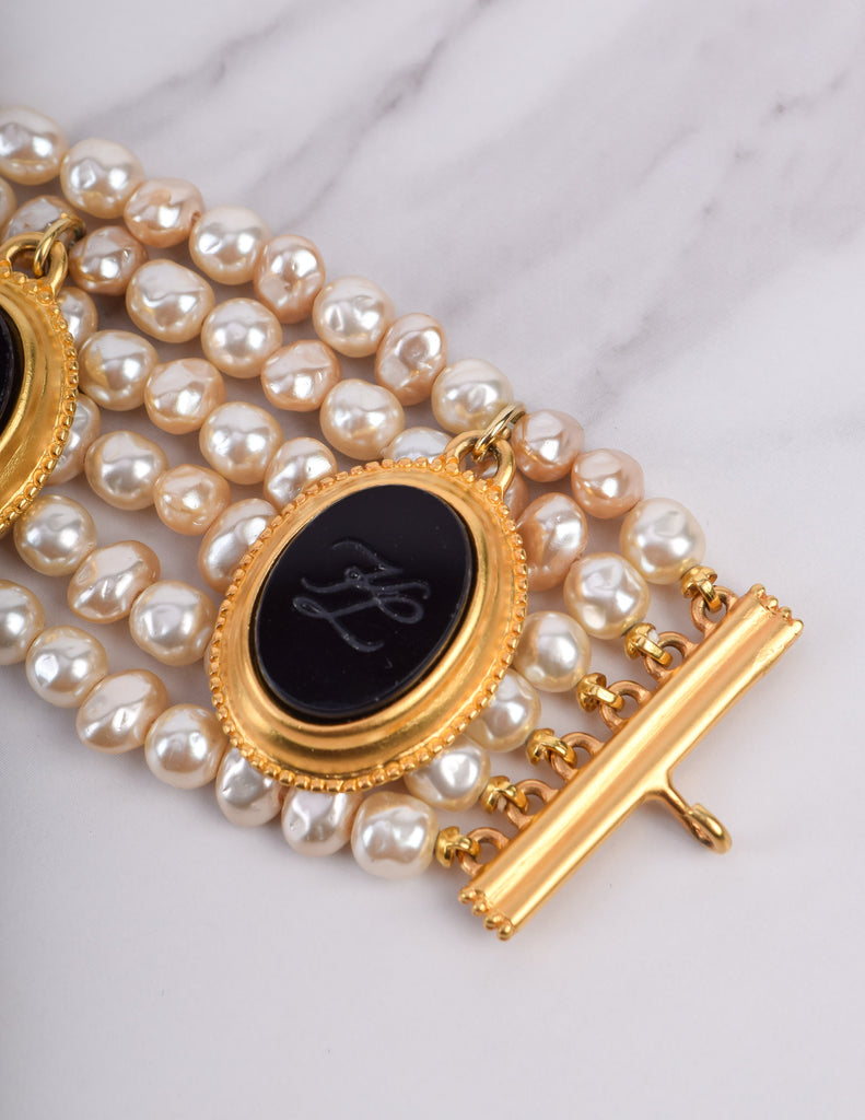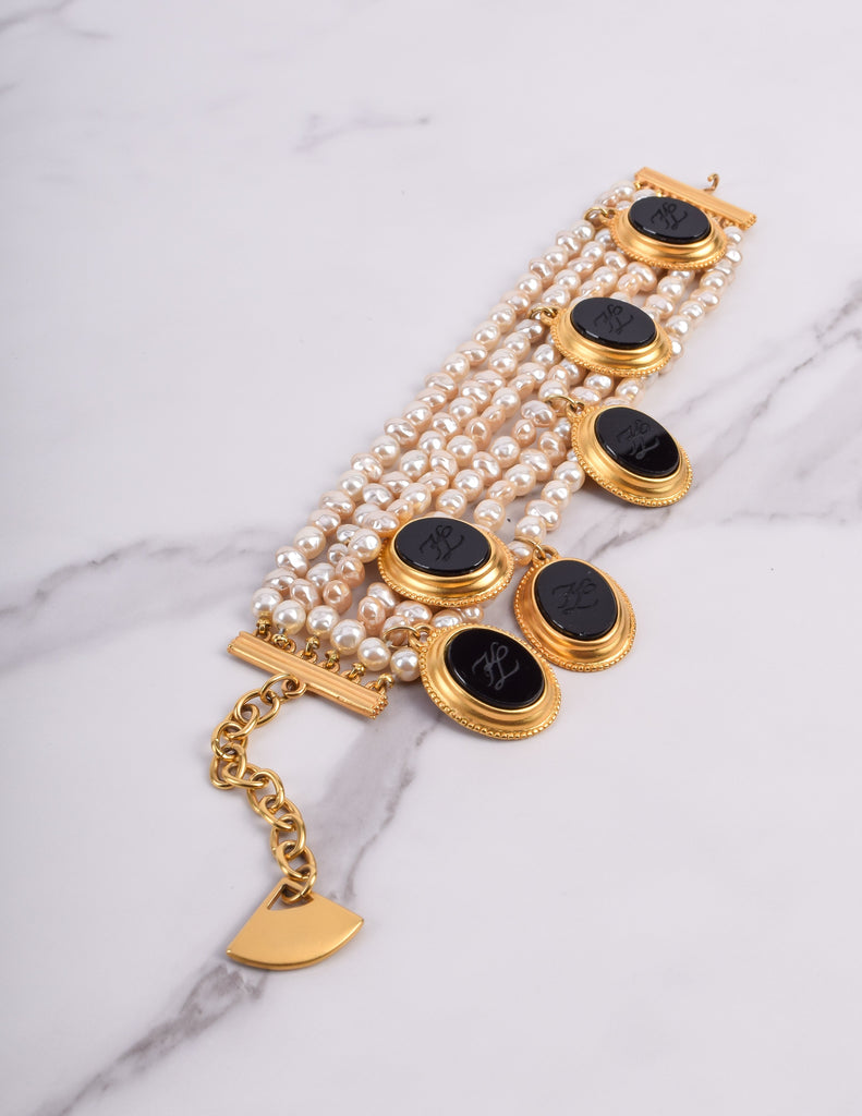 Absolutely breathtaking vintage Karl Lagerfeld bracelet, circa 1989. This stunning piece features six strands of gorgeous baroque pearls. Dangling black glass cameos, each etched with the KL logo and set in gold plated, satin finish frames. Gold plated satin hardware at each end, with an adjustable length and hook closure, and dangling fan charm. A remarkable and rare find.