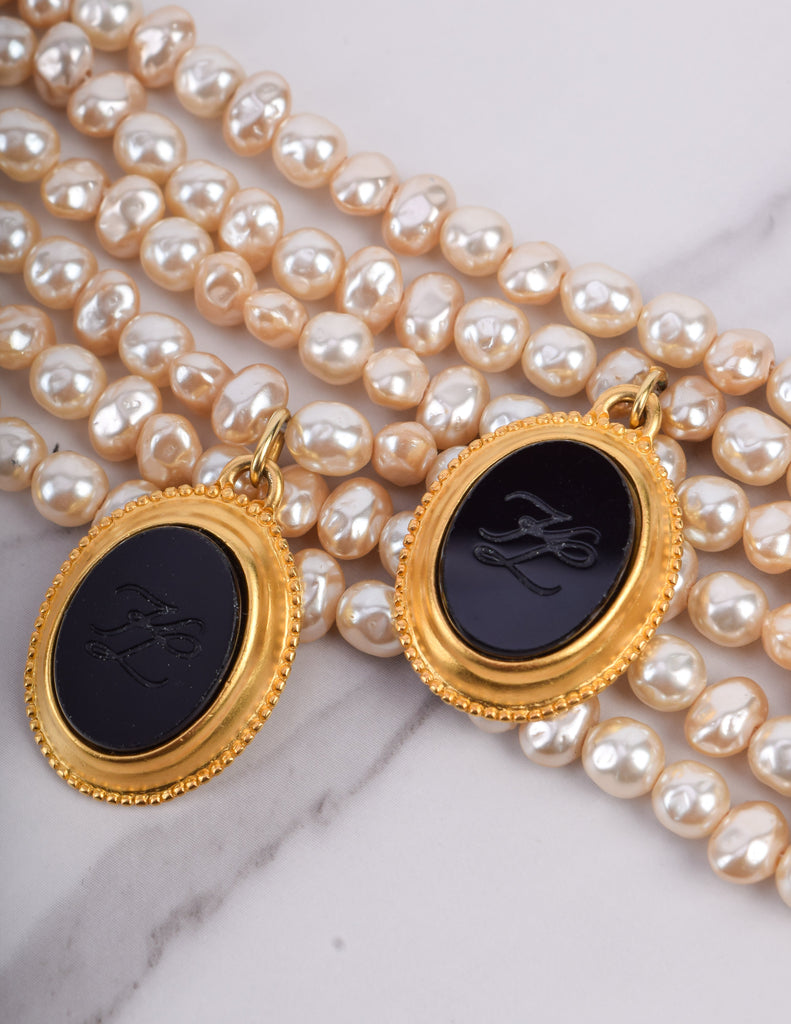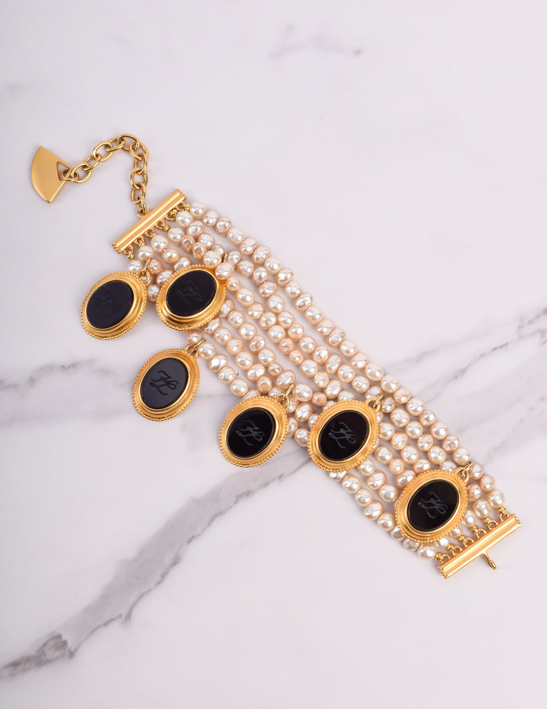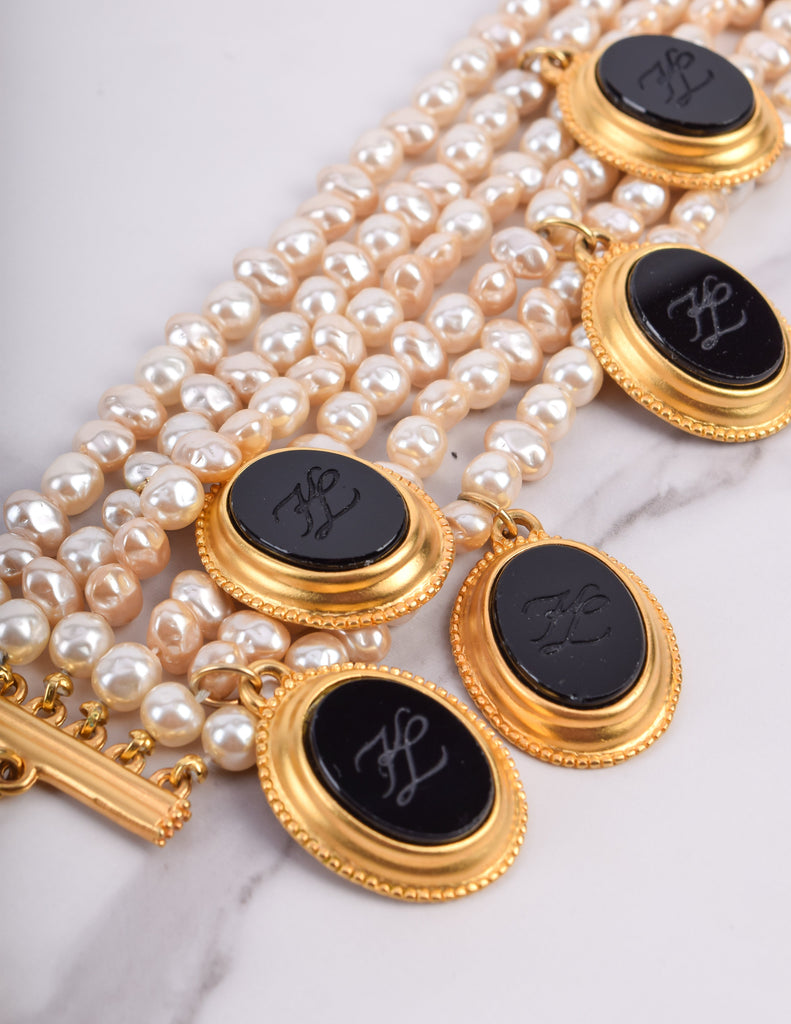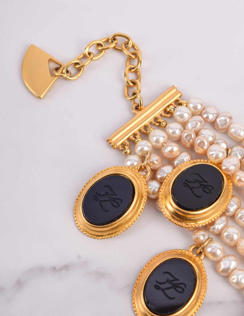 Absolutely breathtaking vintage Karl Lagerfeld bracelet, circa 1989. This stunning piece features six strands of gorgeous baroque pearls. Dangling black glass cameos, each etched with the KL logo and set in gold plated, satin finish frames. Gold plated satin hardware at each end, with an adjustable length and hook closure, and dangling fan charm. A remarkable and rare find.