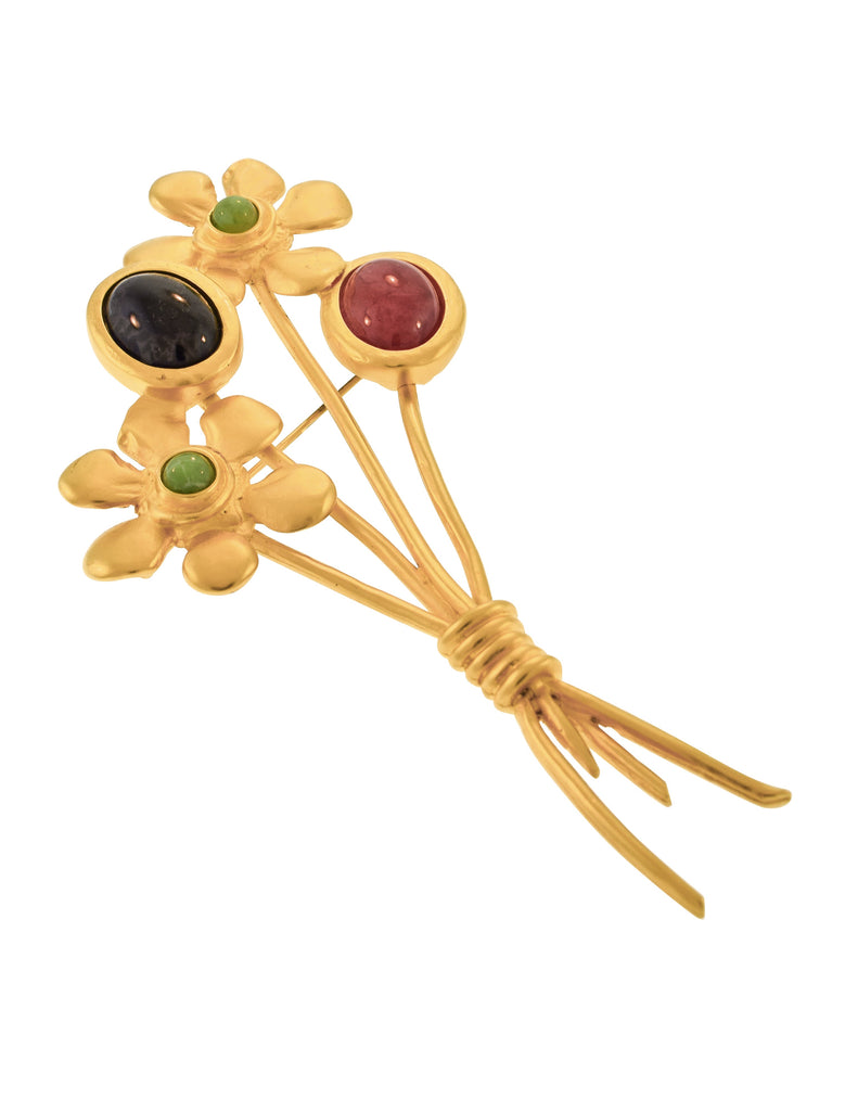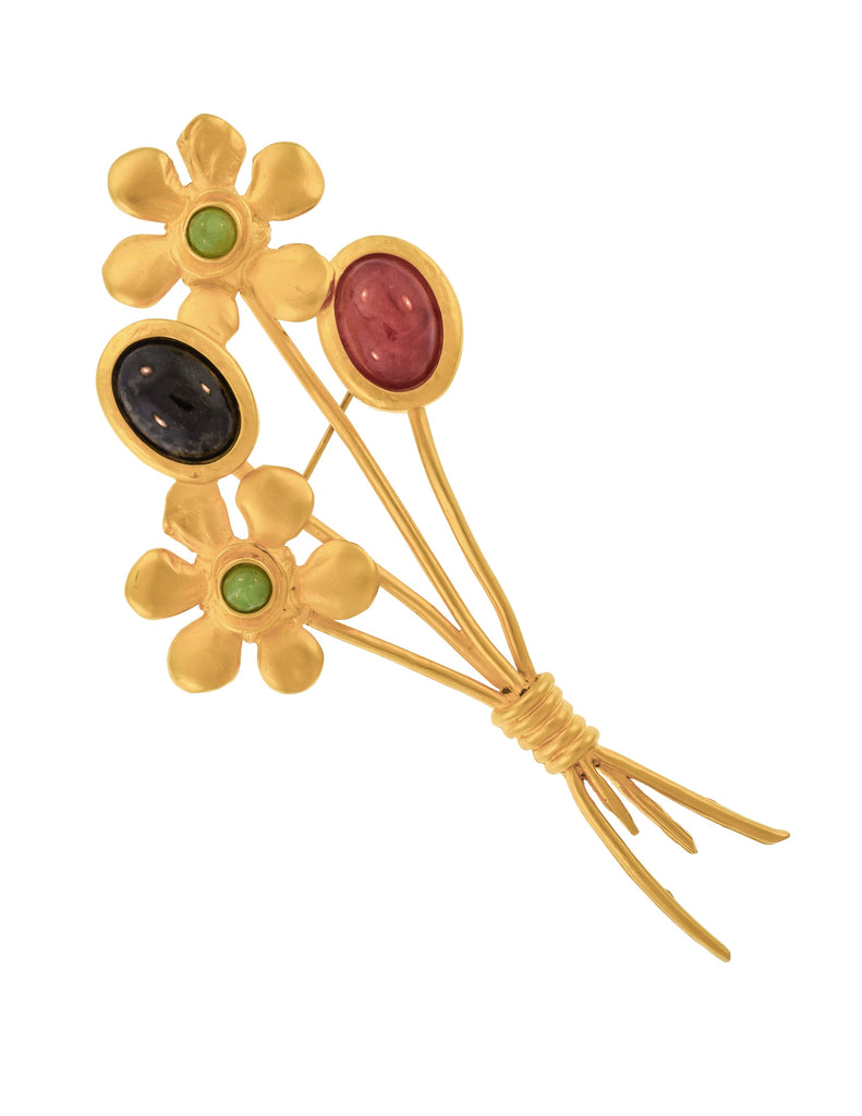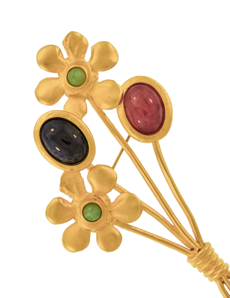 Out of this world vintage Karl Lagerfeld brooch from Spring/Summer 1991. This massive, statement making brooch features a floral bouquet motif comprised of flowers with green quartz centers and deep blue and red marbled cabochons. Artisanal satin gold plated finish. Secure pin back closure. Signed backside.
