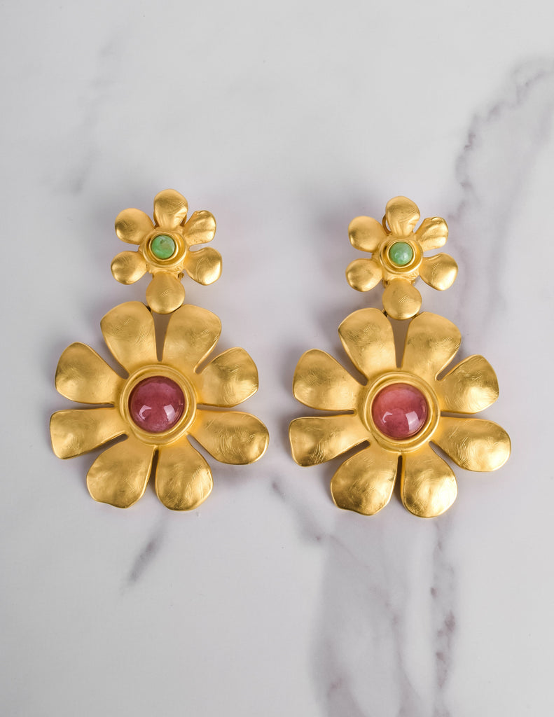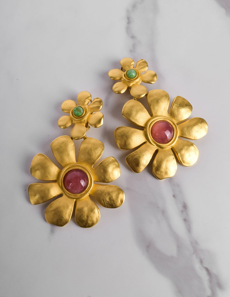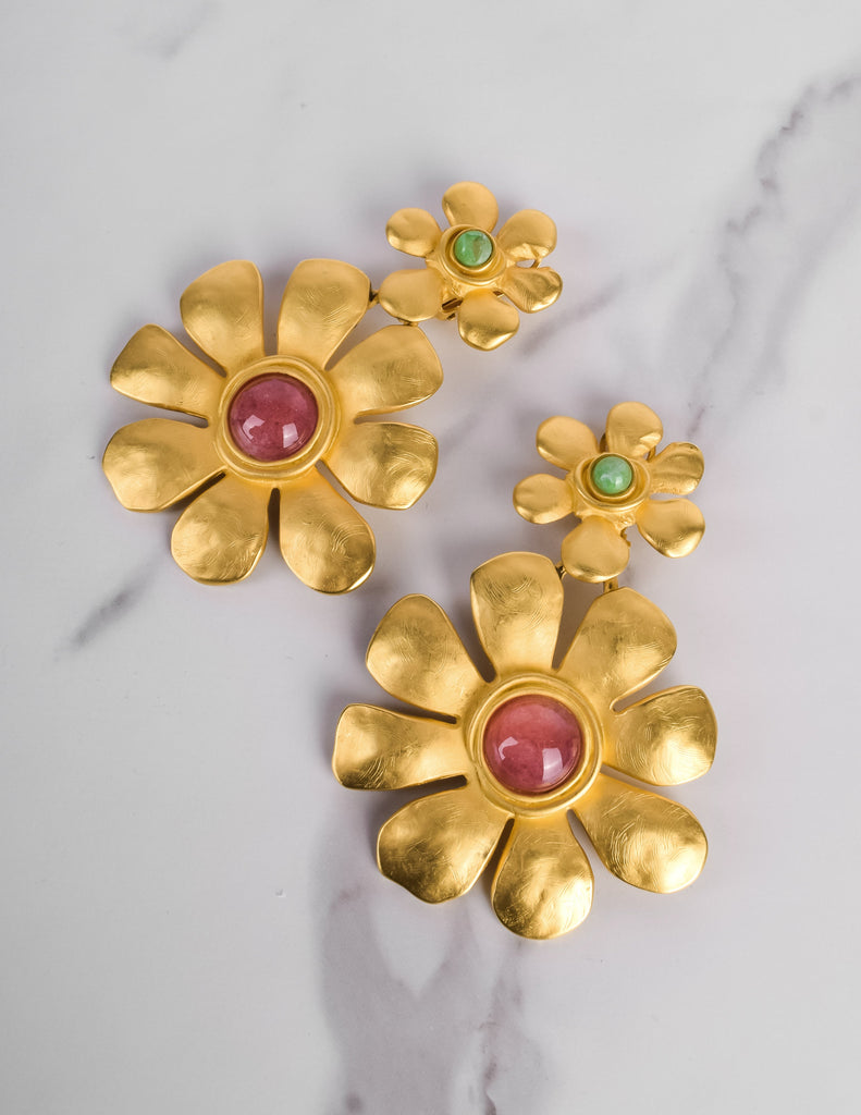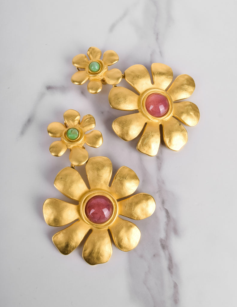 Remarkable vintage Karl Lagerfeld earrings from Spring/Summer 1991, the flower motif shown here pictured in the Bloomingdales ad. Hammered, artisanal satin gold plated finish. A bold, large flower with muted red marbled glass cabochons dangling from a smaller flower with green glass cabochon centers. Gigantic, statement making size. Signed, clip on back.