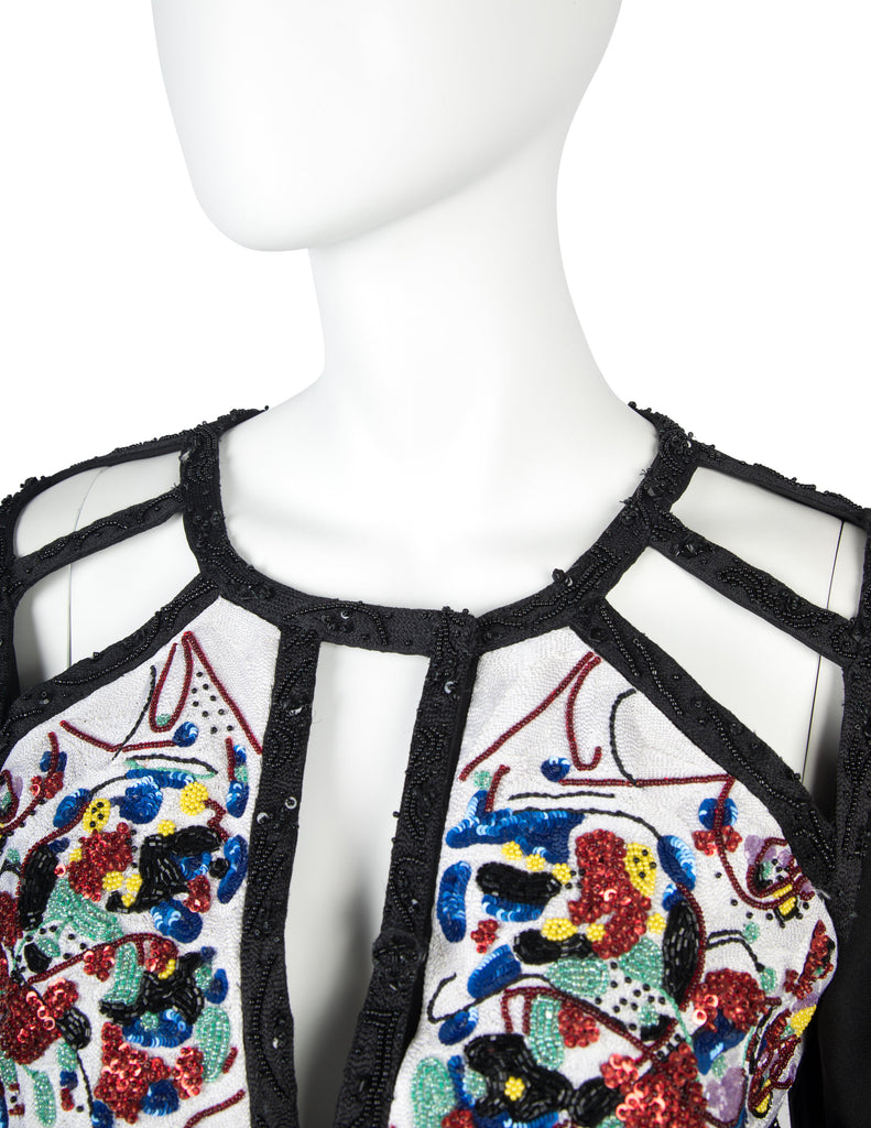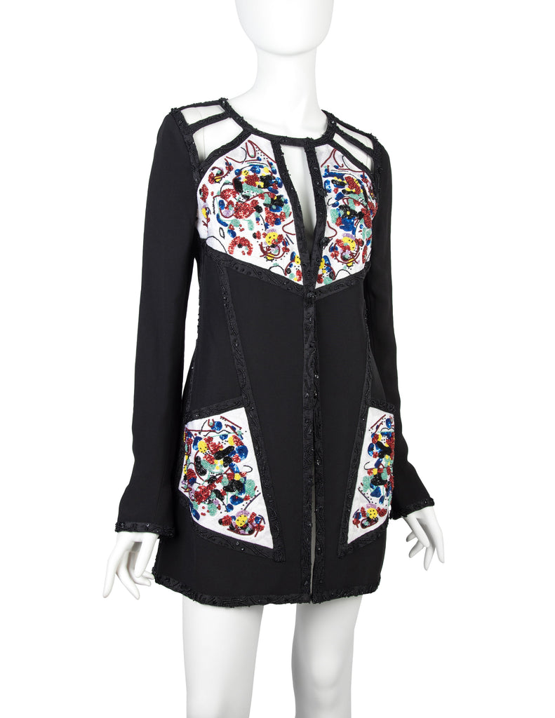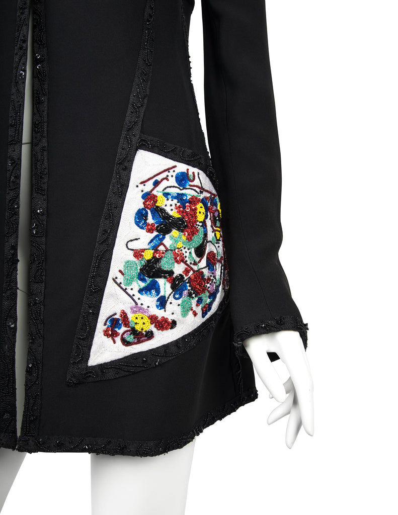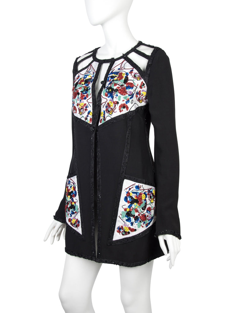One of our most favorite Karl Lagerfeld pieces we've ever had! Fantastic vintage longline jacket from Spring/Summer 1993, shown here documented on the runway. Deep black rayon-viscose blend crepe, featuring panels of whimsically arrayed multicolor glass beading and sequins. Black glass beading and sequining trimmings. Incredible, plunging triangular cutout at neck/bust line. Snap closure at front center, covered with a decorative partial button placket. Open from the waist down for an effortless styling. Long sleeves with slit cuffs. Functional pockets at hips. Fully lined in acetate. An insanely cool and ultra piece.