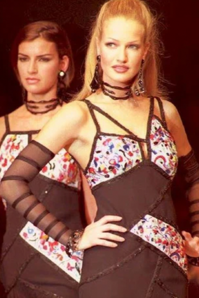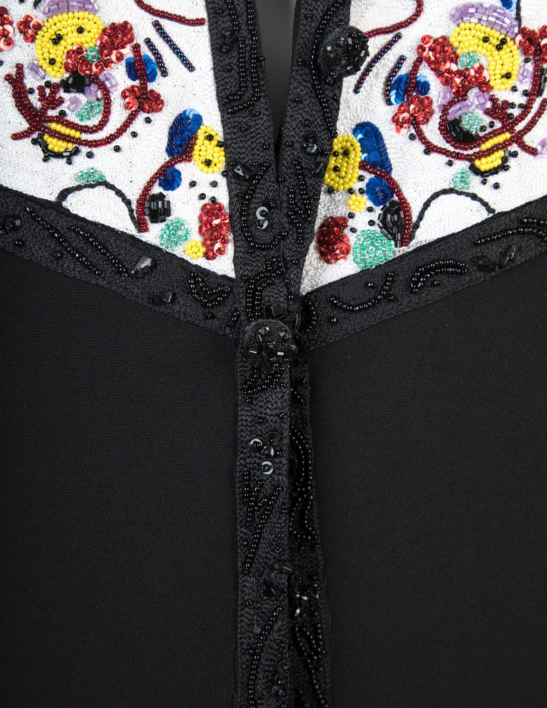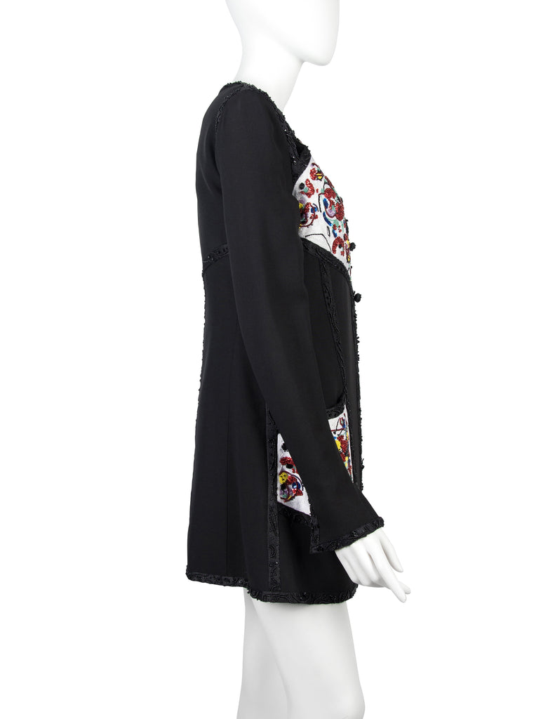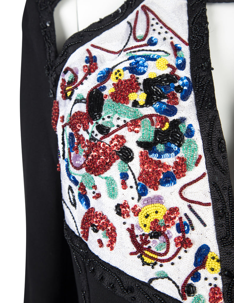 One of our most favorite Karl Lagerfeld pieces we've ever had! Fantastic vintage longline jacket from Spring/Summer 1993, shown here documented on the runway. Deep black rayon-viscose blend crepe, featuring panels of whimsically arrayed multicolor glass beading and sequins. Black glass beading and sequining trimmings. Incredible, plunging triangular cutout at neck/bust line. Snap closure at front center, covered with a decorative partial button placket. Open from the waist down for an effortless styling. Long sleeves with slit cuffs. Functional pockets at hips. Fully lined in acetate. An insanely cool and ultra piece.