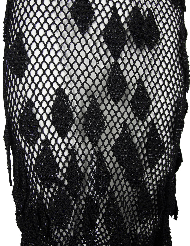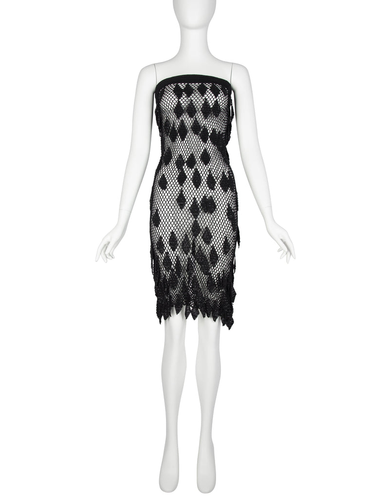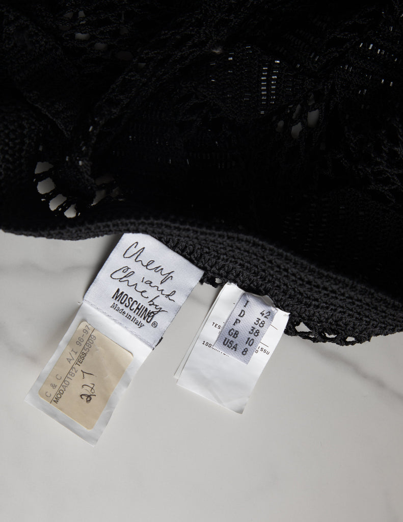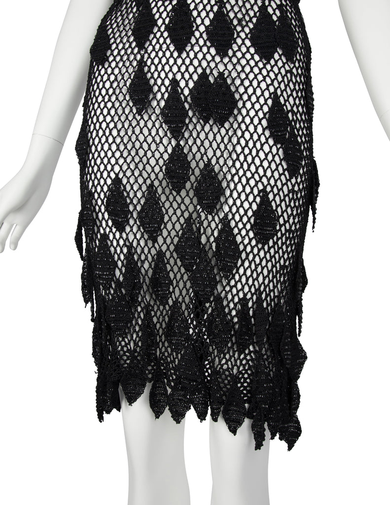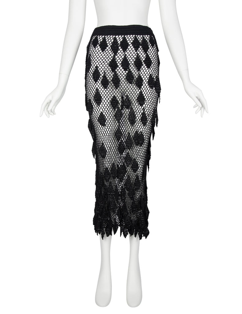 Incredible vintage Moschino Cheap and Chic skirt from Fall/Winter 1996. This fantastic piece can be styled a number of ways, including as a dress like we've shown here. Unlined and fully see-through black rayon crochet net with an stretch, inner elastic waistband. Beaded, dangling leaves sporadically attached throughout.