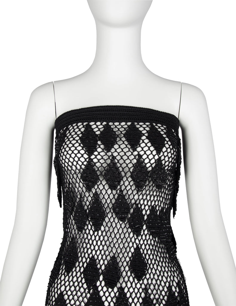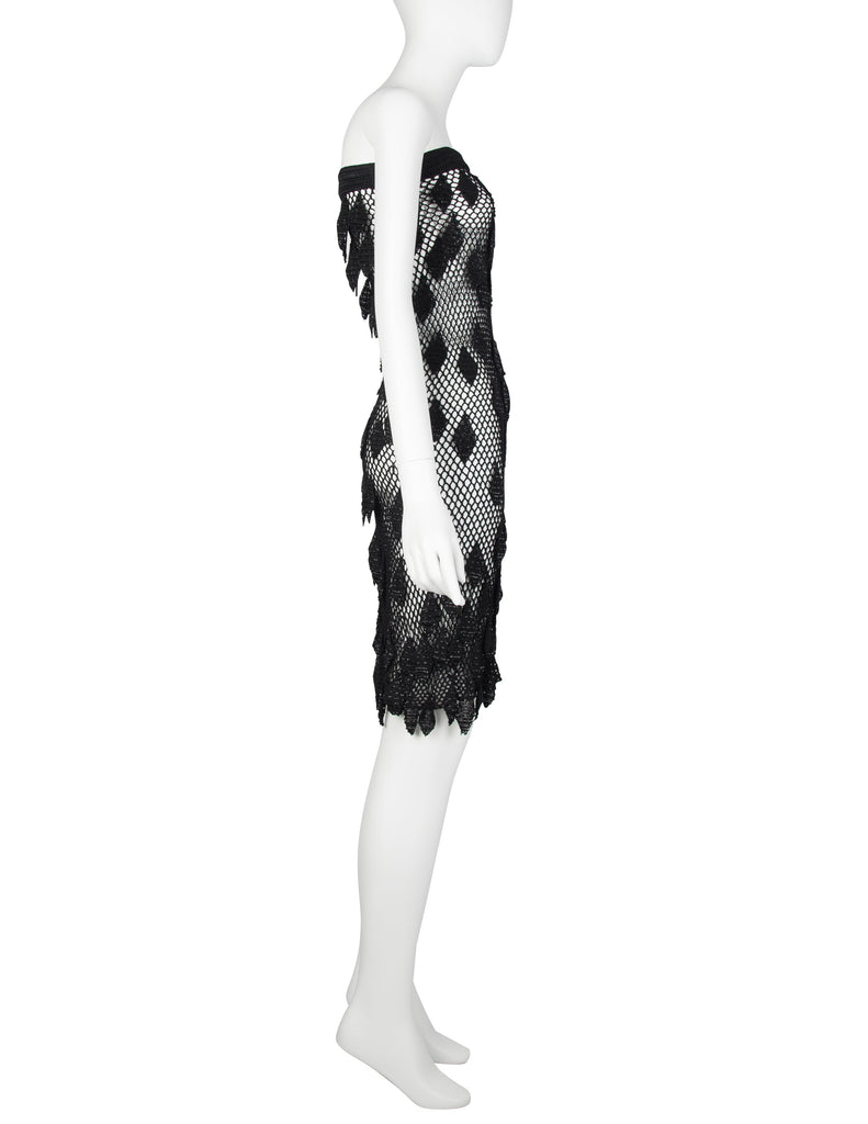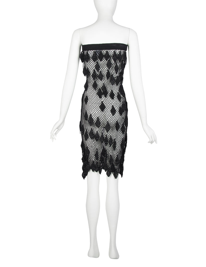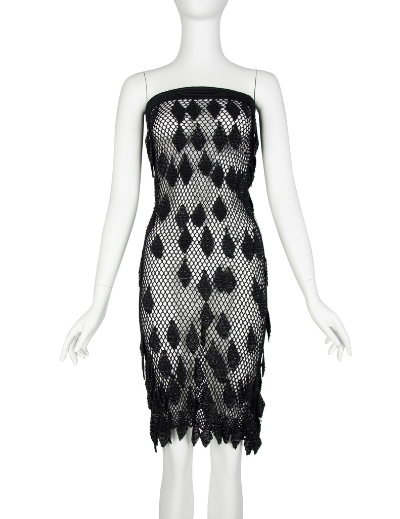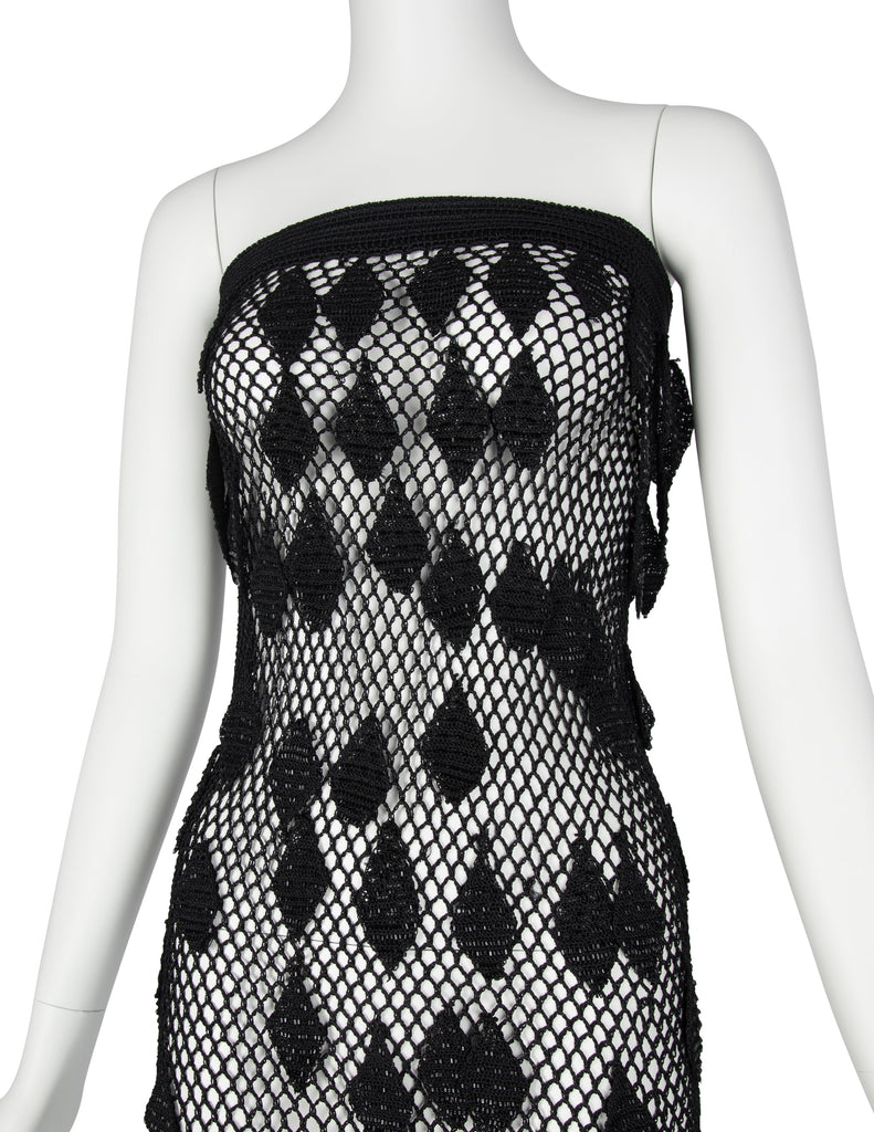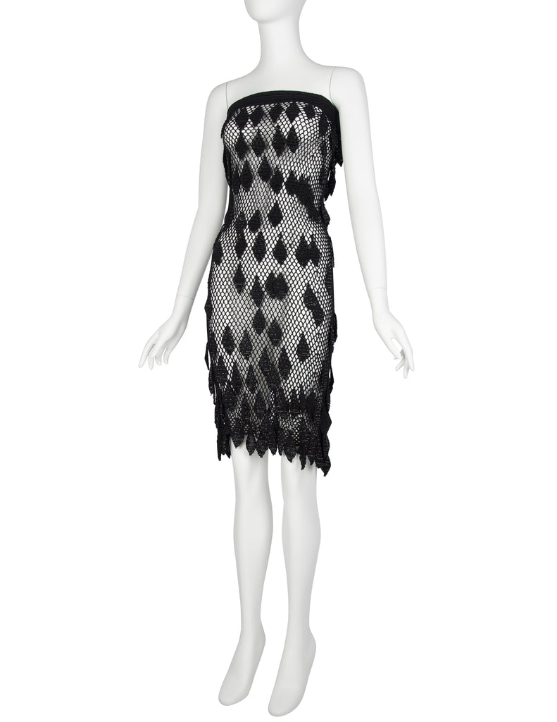 Incredible vintage Moschino Cheap and Chic skirt from Fall/Winter 1996. This fantastic piece can be styled a number of ways, including as a dress like we've shown here. Unlined and fully see-through black rayon crochet net with an stretch, inner elastic waistband. Beaded, dangling leaves sporadically attached throughout.