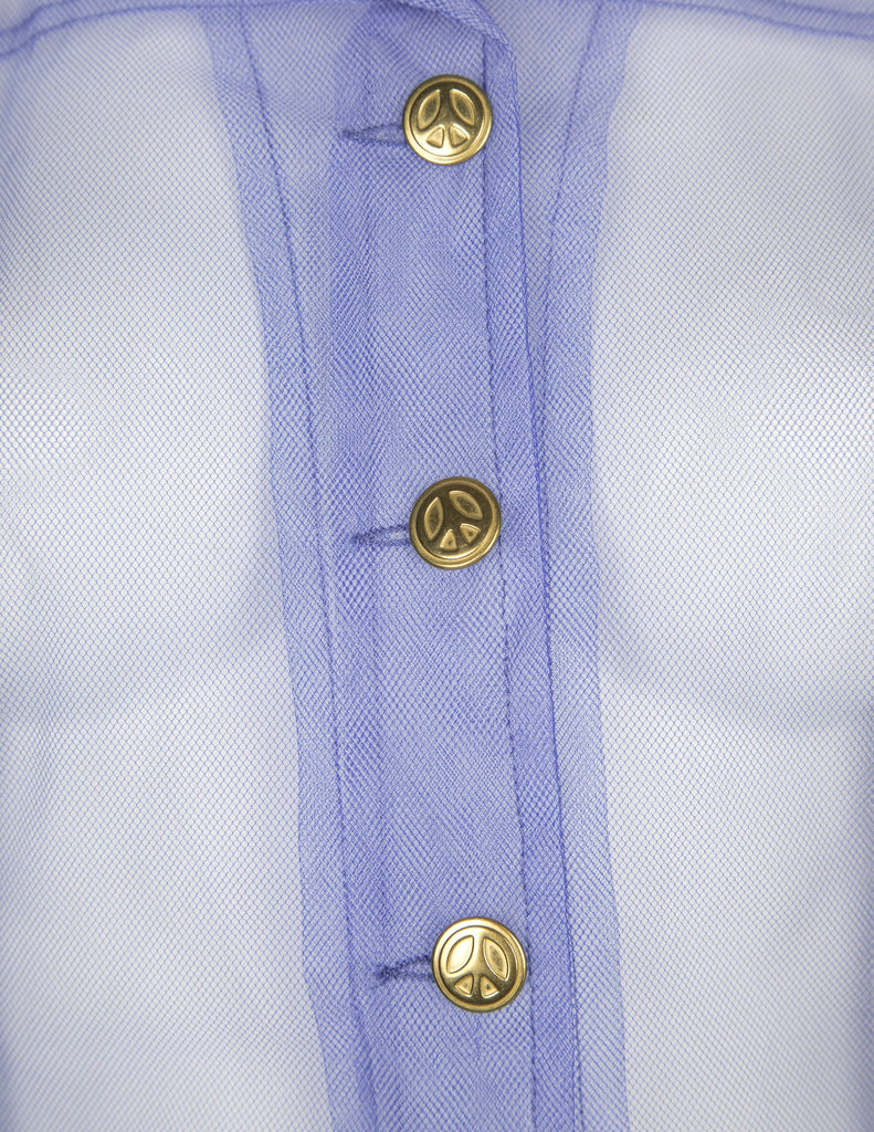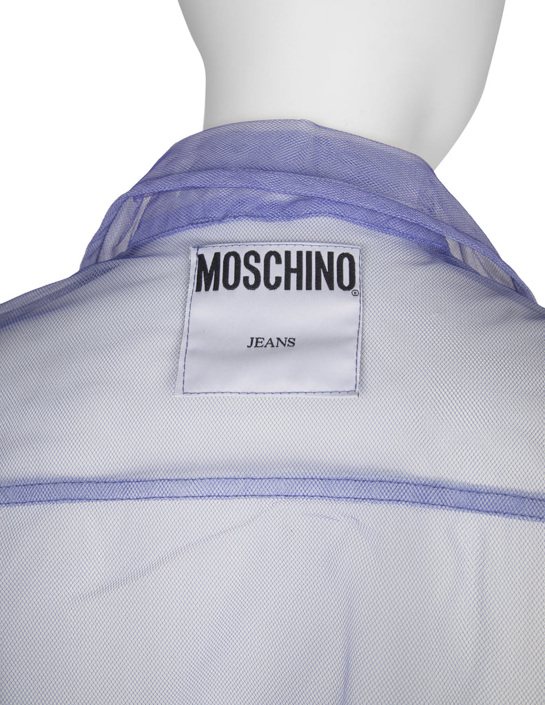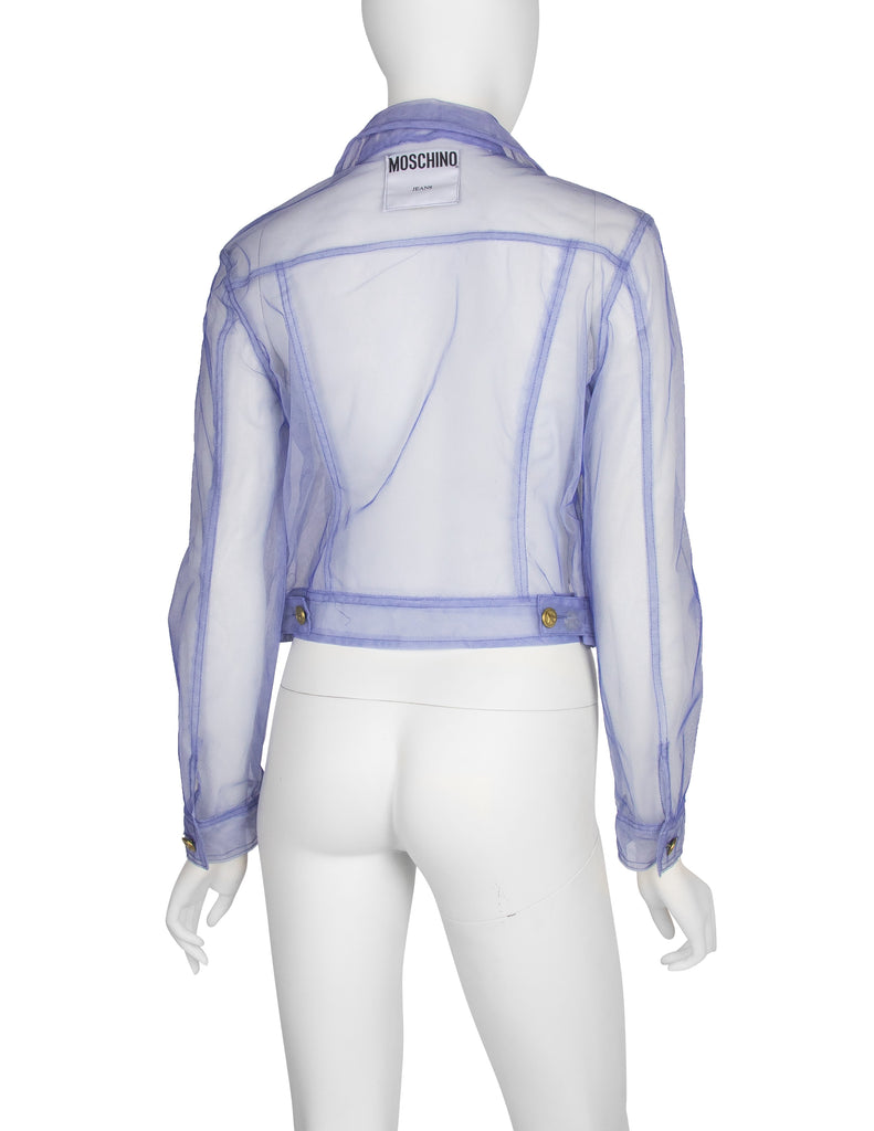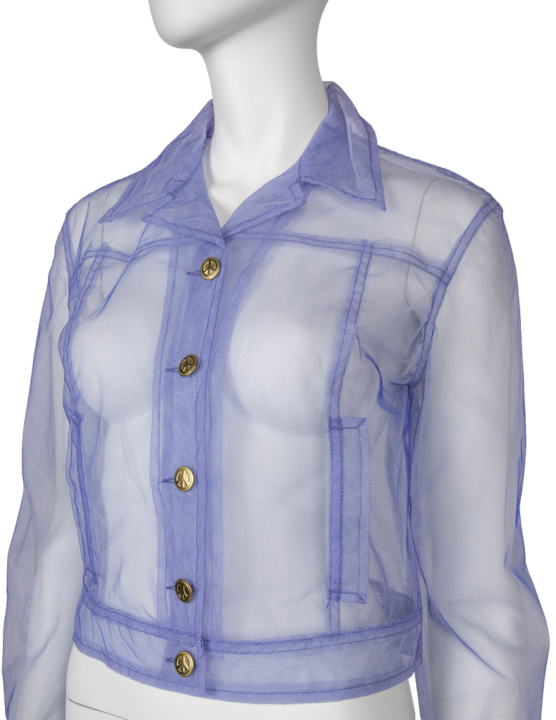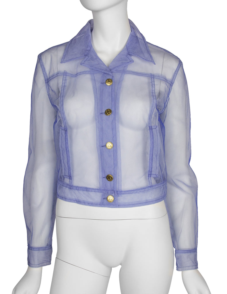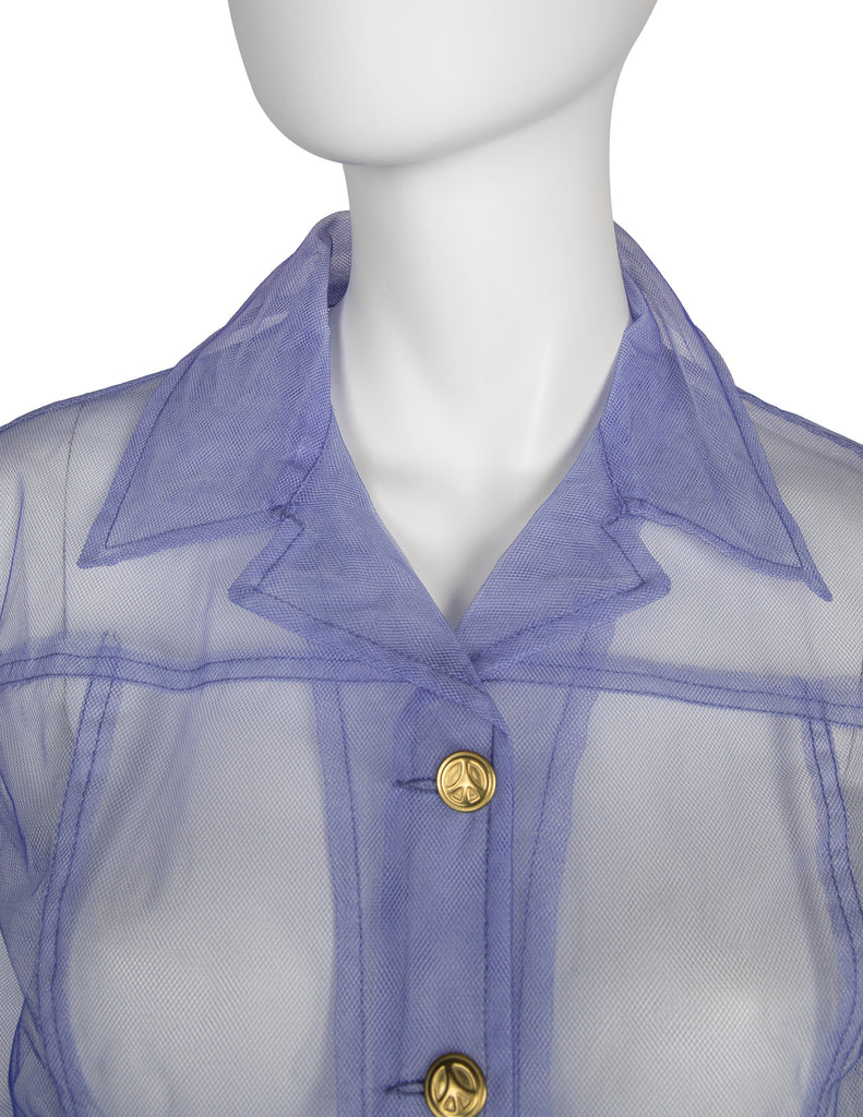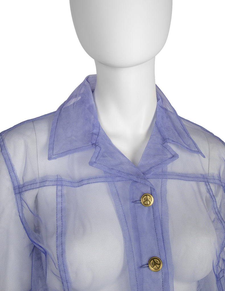 Completely obsessed with this rare vintage Moschino jacket. The most stunning shade of periwinkle blue mesh tulle, completely sheer and see-through, with styling and seam work like a denim jacket. Button up closure at front and cuff featuring brass peace sign buttons. Functional pockets at front. Softly structured. Statement making, iconic Moschino label placed at the outside upper back. A total dream.