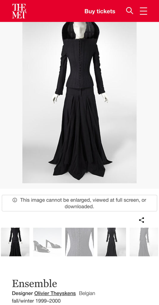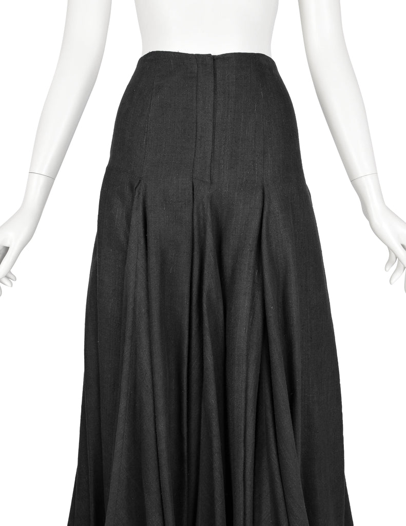 Breathtaking vintage Olivier Theyskens skirt, from Fall/Winter 1999, shown here as part of The Met's collection, and the shorter version shown here documented on the runway. This rare and fantastic piece comes in a heavy, woven raw silk in the deepest charcoal grey (almost black). Fitted waist with a zip fly closure at front center. Concealed pockets at hips. A-line, super full pleated bottom that cascades into an incredible pointed hem that sweeps the floor. The upper waist is lined in the same fabric, while the rest of the skirt is unlined. A museum-worthy treasure that you will love forever and ever.