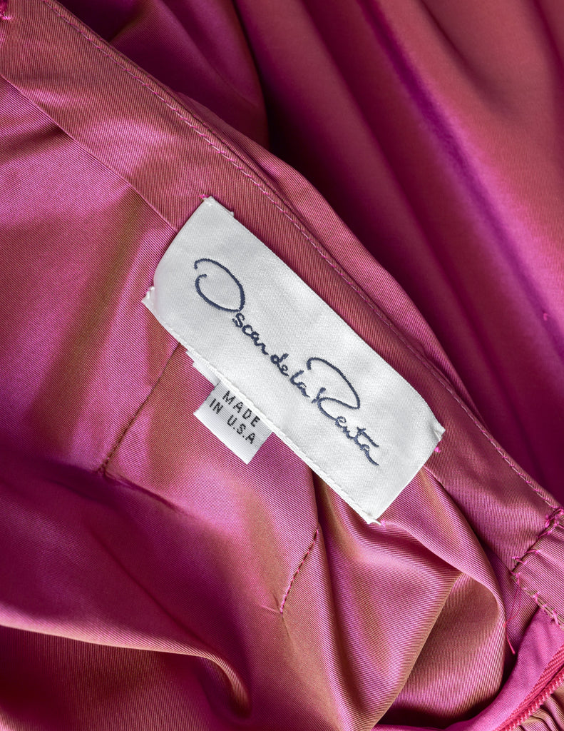 Incredible vintage Oscar de la Renta ensemble from Fall/Winter 2001. This beautiful set comes with three total pieces - a top, camisole, and skirt. Absolutely gorgeous and intricate metallic burnished gold lace top with stunning details and massive puffed sleeves. See through, backed in beige mesh, with zipper at back side, comes with beige colored stretch camisole tank. Top has slight stretch. Gorgeous pink silk silk taffeta full length skirt that exhibits a gold iridescent overtone. The skirt has a ruched back near the zipper and a ruffle that begins at the waist, goes down the backside, and spans the hem to become a train. The ruffle also snaps to conceal the zipper track. Shown here documented on the runway. Completely divine!