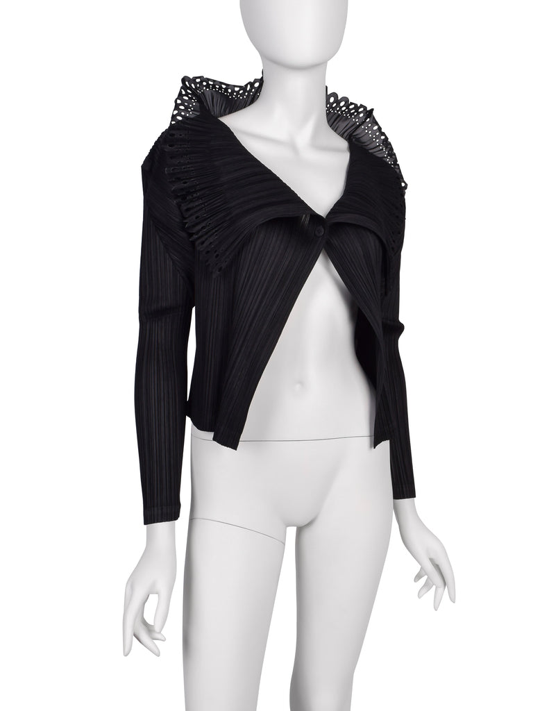 Chic vintage Pleats Please by Issey Miyake piece. Cardigan style top/jacket in classic pleated black fabric featuring a dramaticfFold over or standing laser cut lace look-alike collar. Single button closure at bodice. Long sleeve. Great styling piece for Fall or Spring.