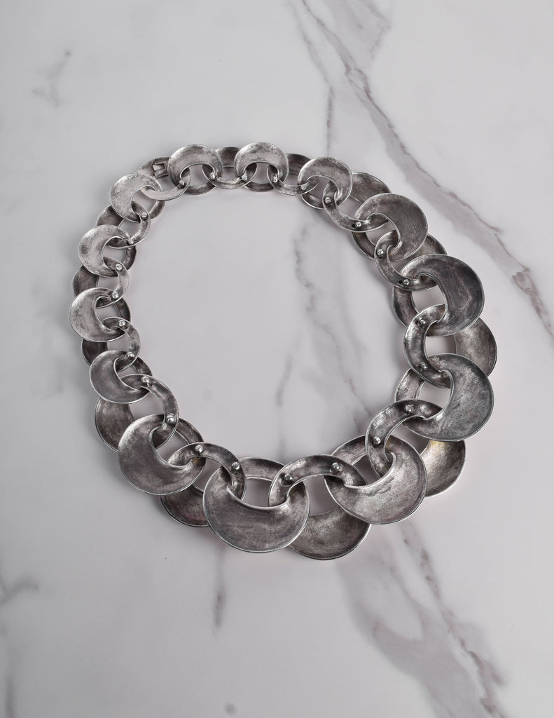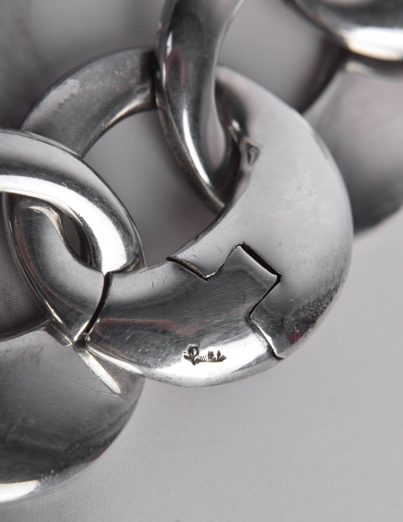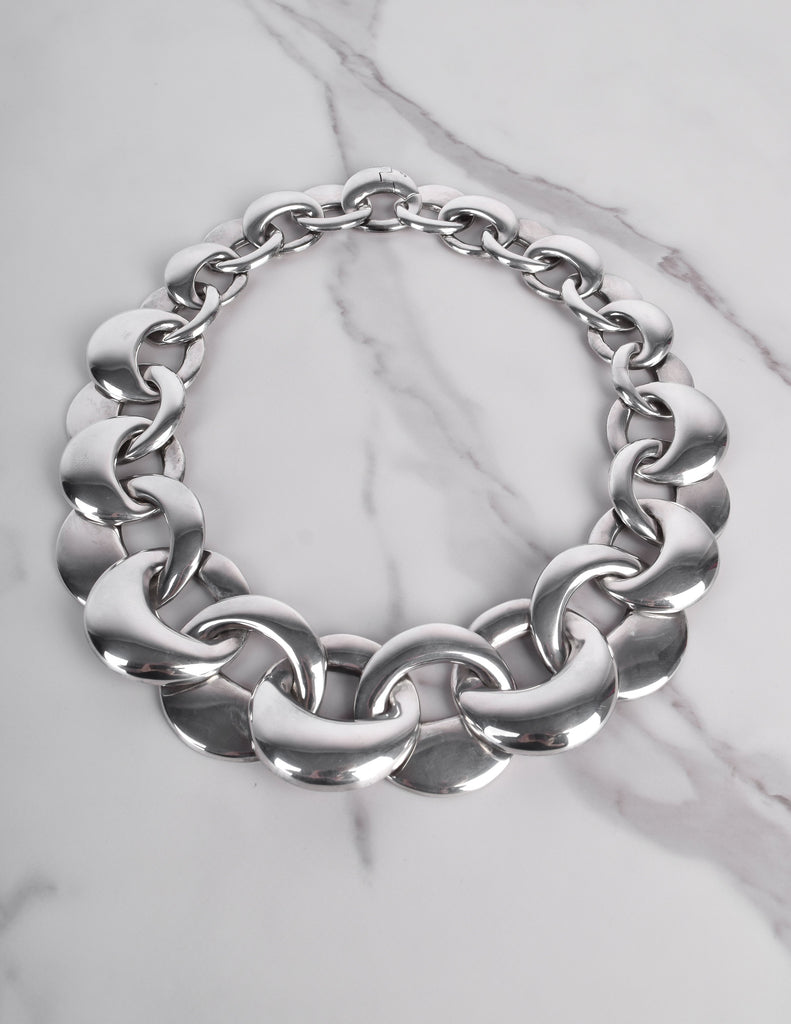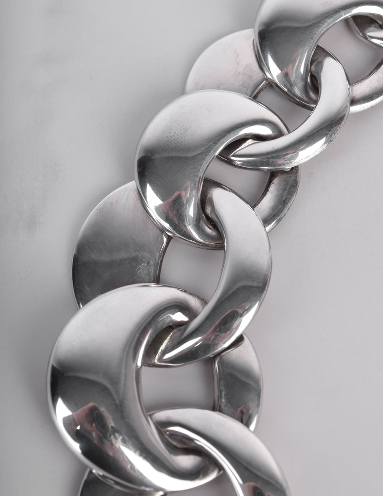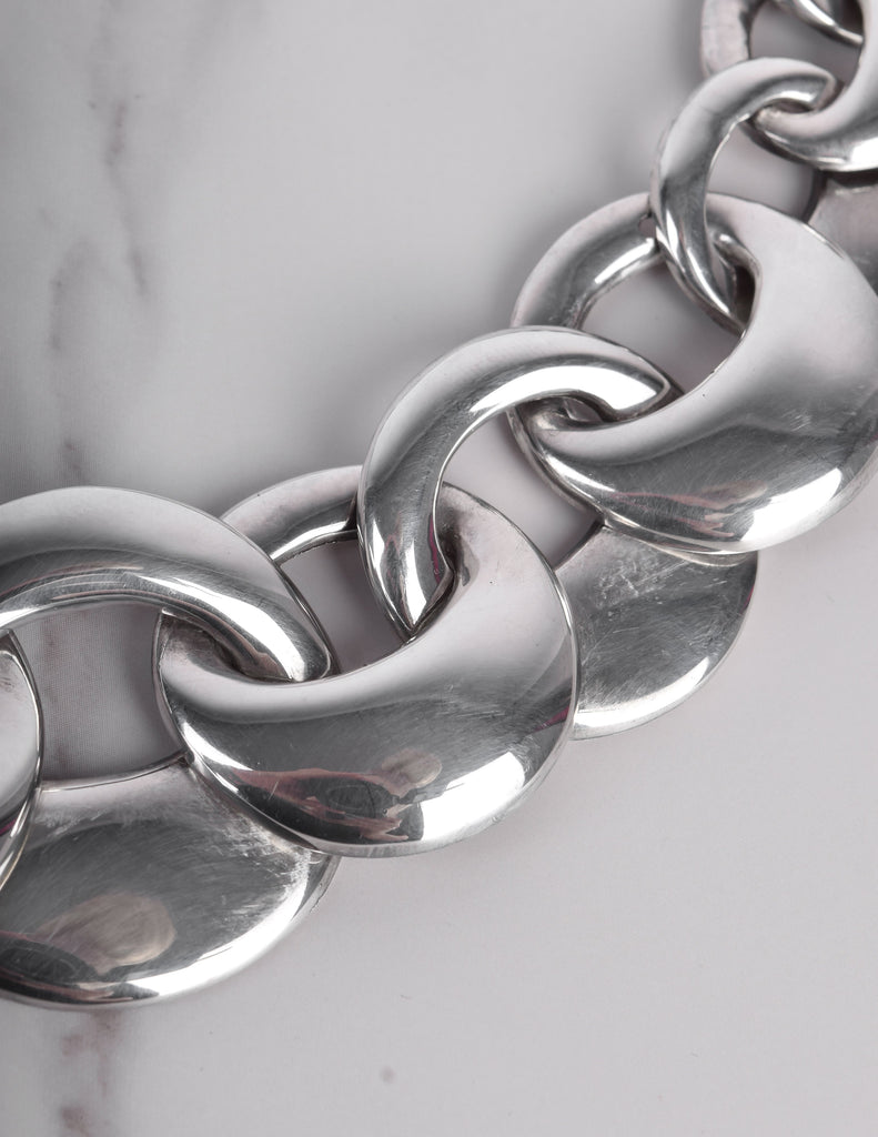 Stunning vintage Pomellato necklace in sterling silver. Statement making, oversized, chunky flat interlocking chain necklace graduating in size toward the front center. Infinity loop, signed clasp inconspicuously within. A gorgeous luxury piece.