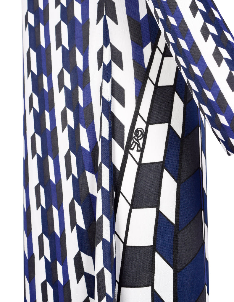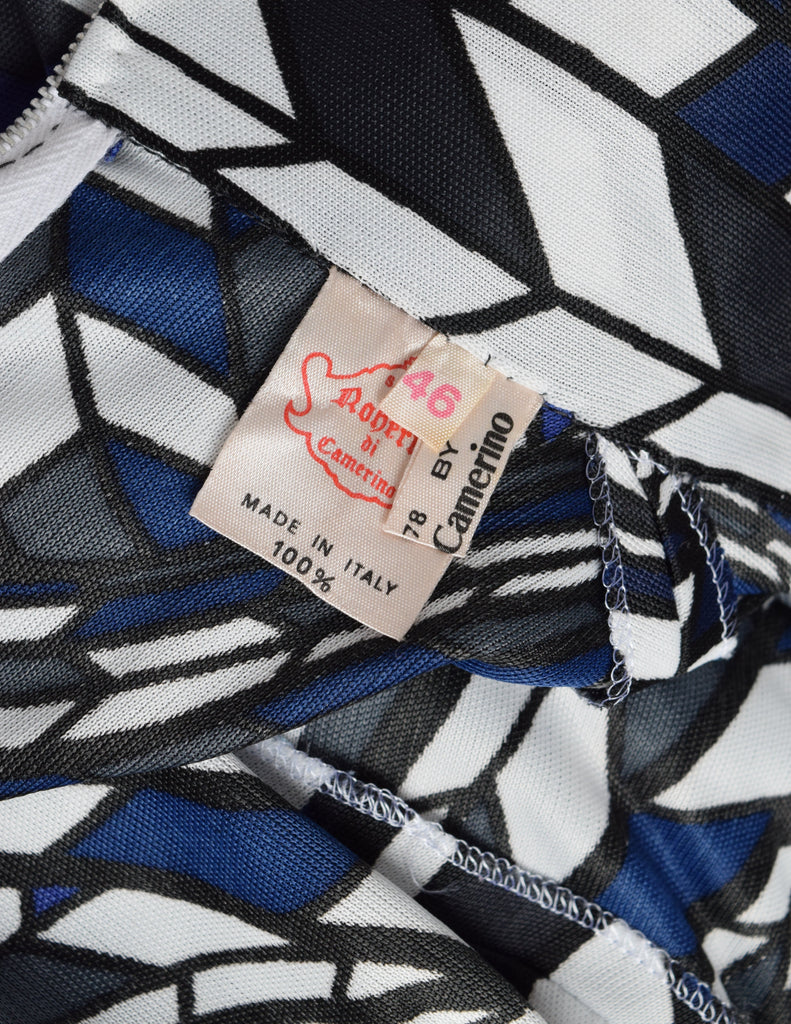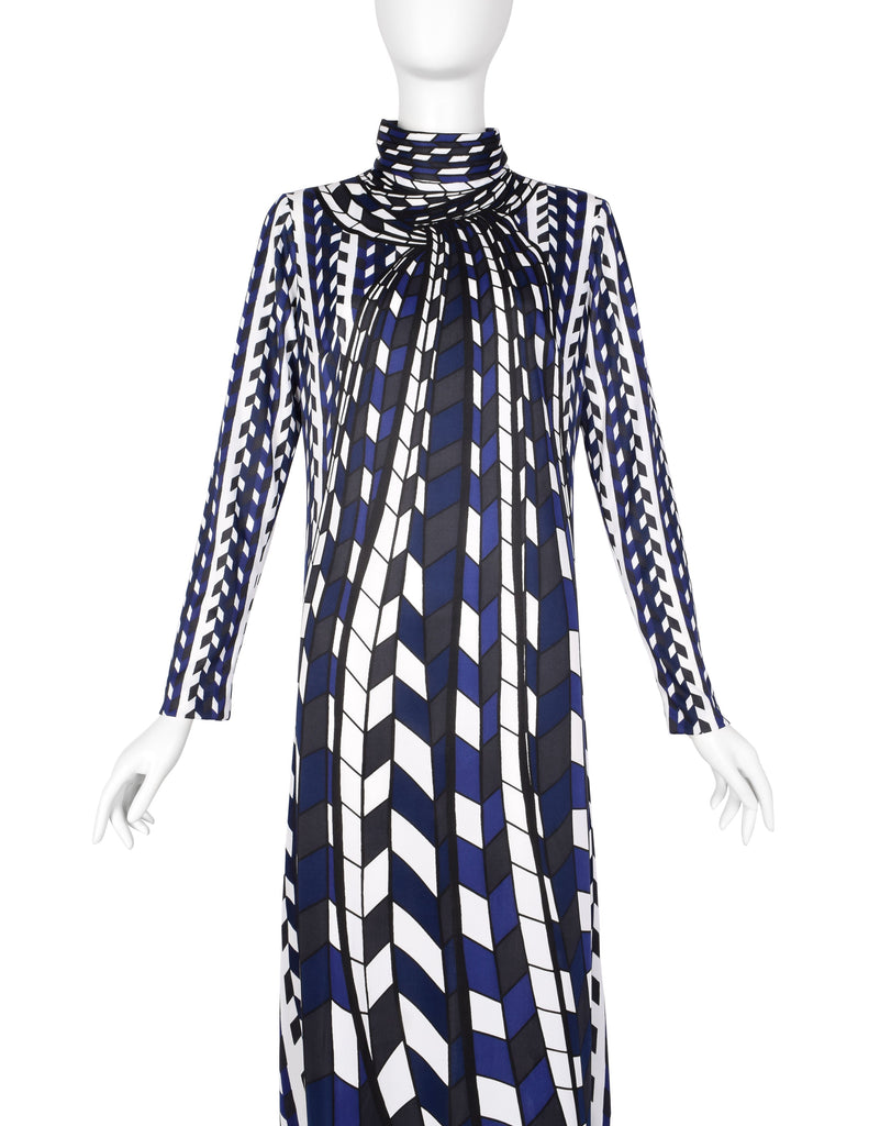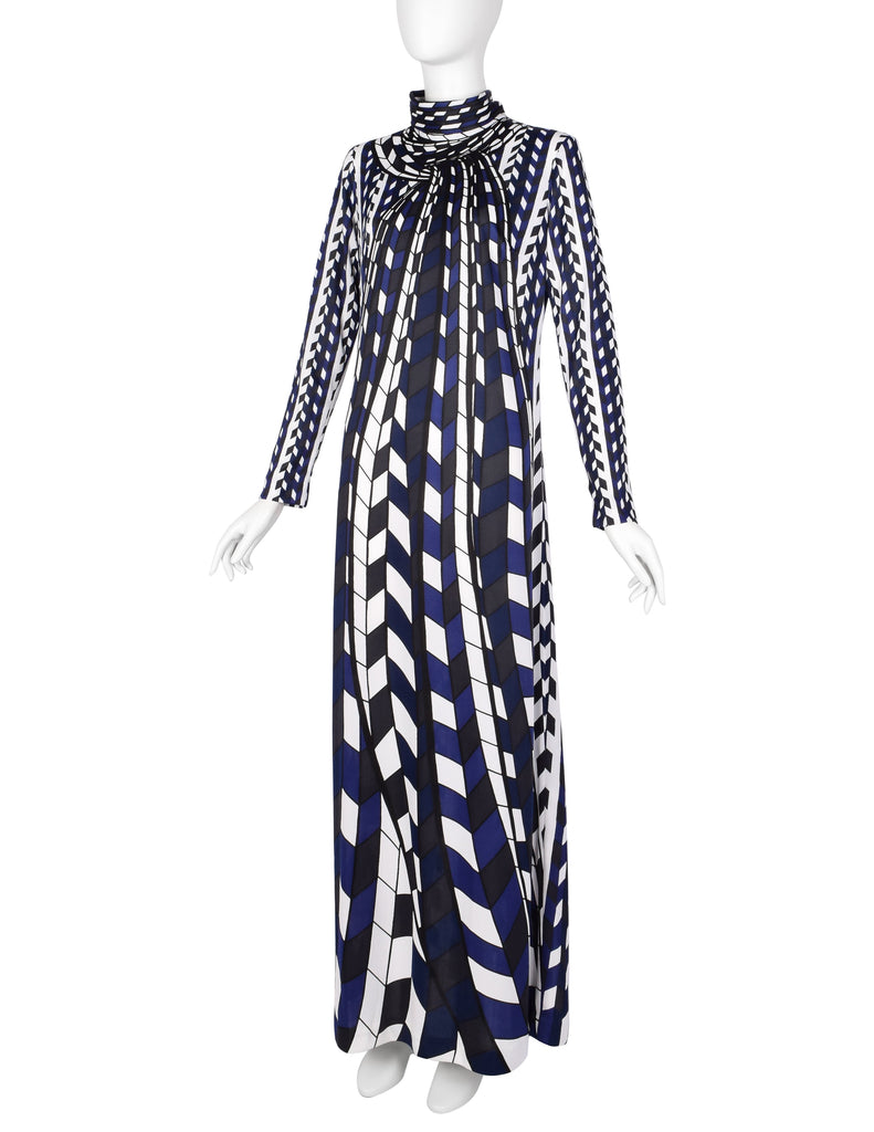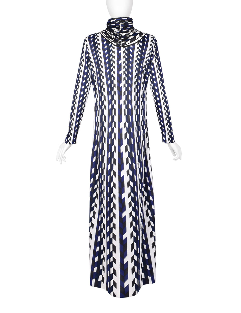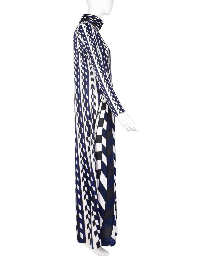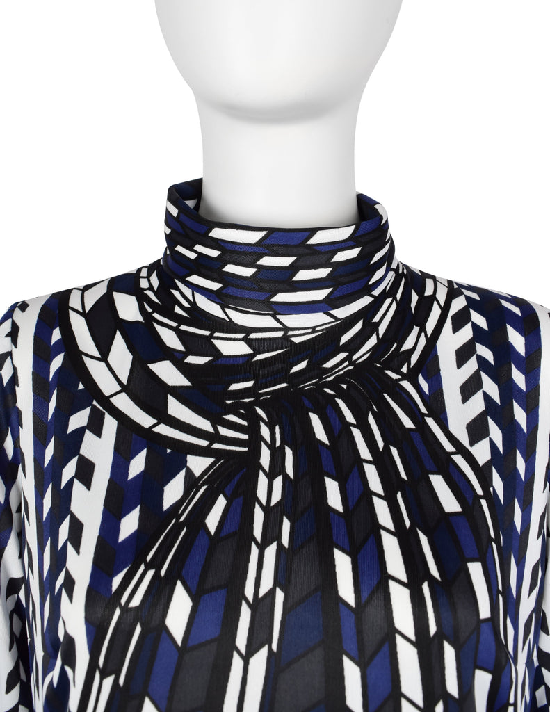 Phenomenal vintage Roberta di Camerino dress from 1978. Striking and incredible op-art inspired print in black, blue, white, and grey. A trompe l'oeil scarf is printed within, extending from the fold over neckline. Darted bust. Full length maxi. Long sleeve. Medium-weight, slinky poly jersey. Zip closure at back center. Obtained from the RDC Archive, this dress has never been worn.