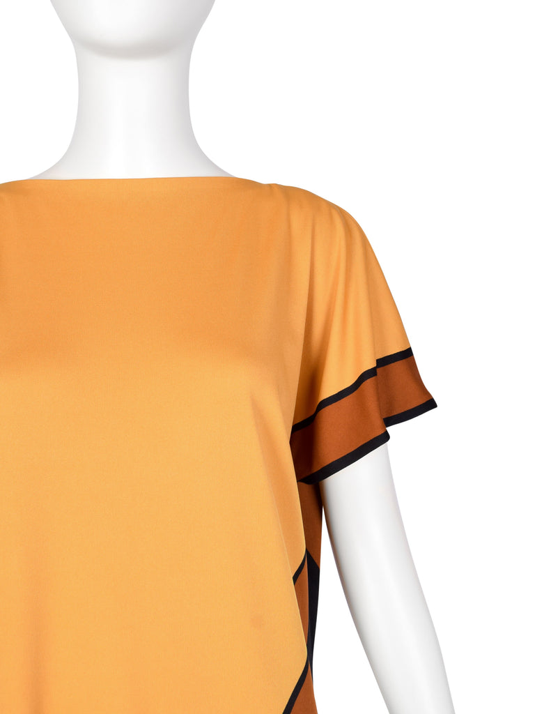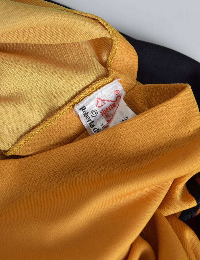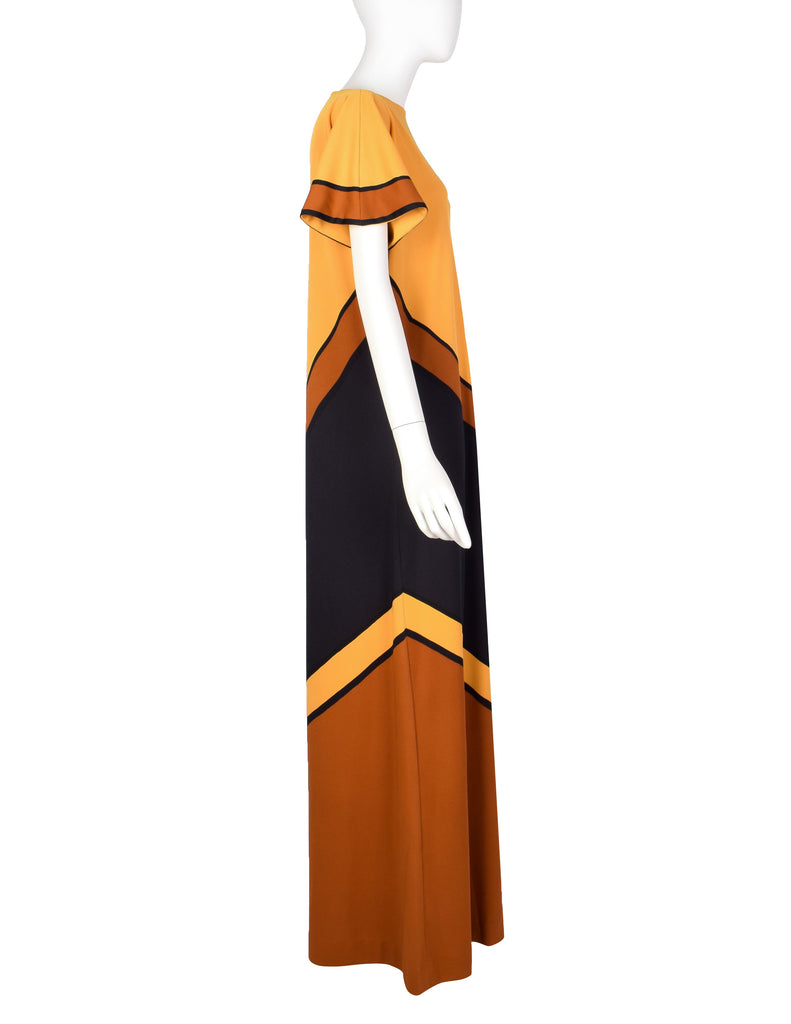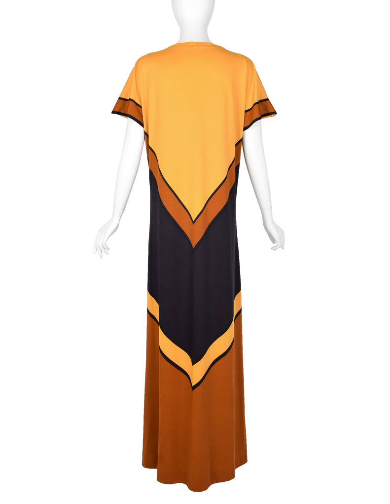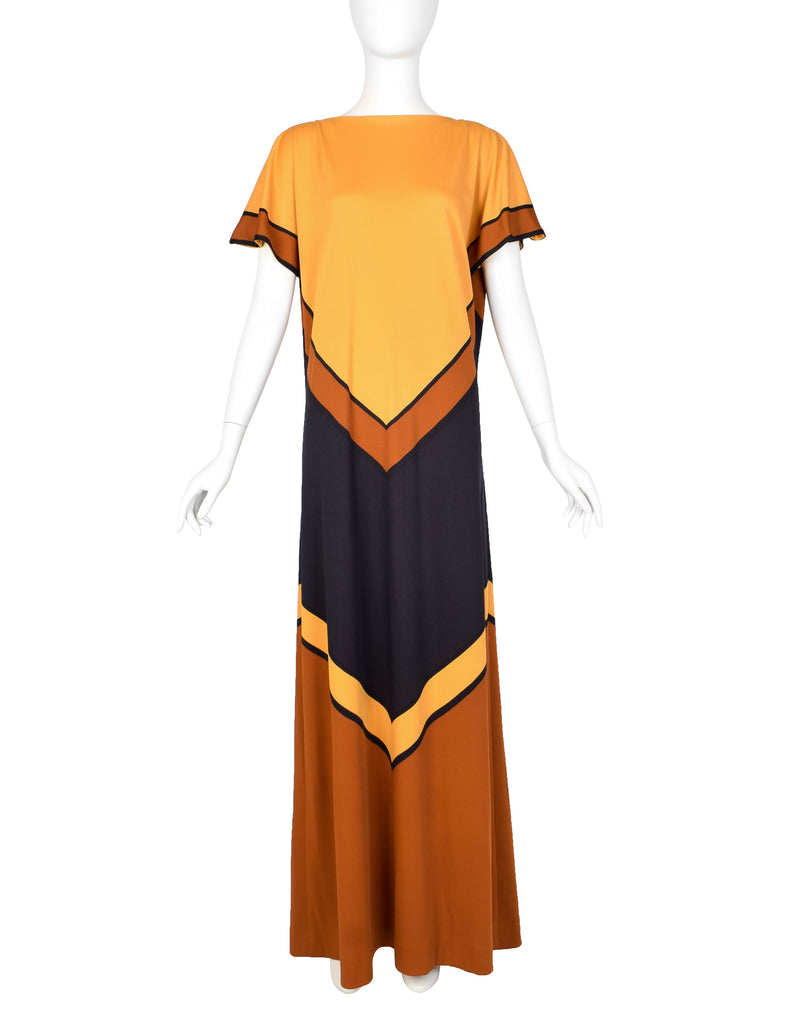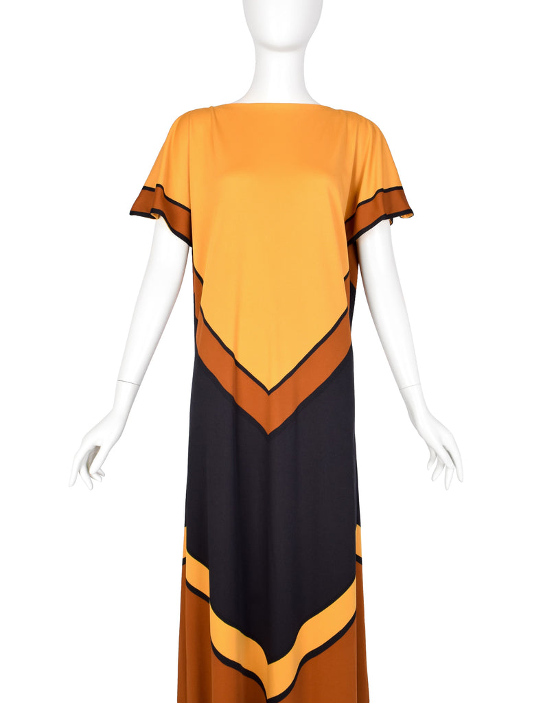 Incredible vintage Roberta di Camerino dress c. 1978. Striking colorblock chevron V print in mustard, orangish brown, and black. A line silhouette with flutter sleeve. Full length maxi. Medium-weight poly jersey. Obtained from the RDC Archive, this dress has never been worn.
