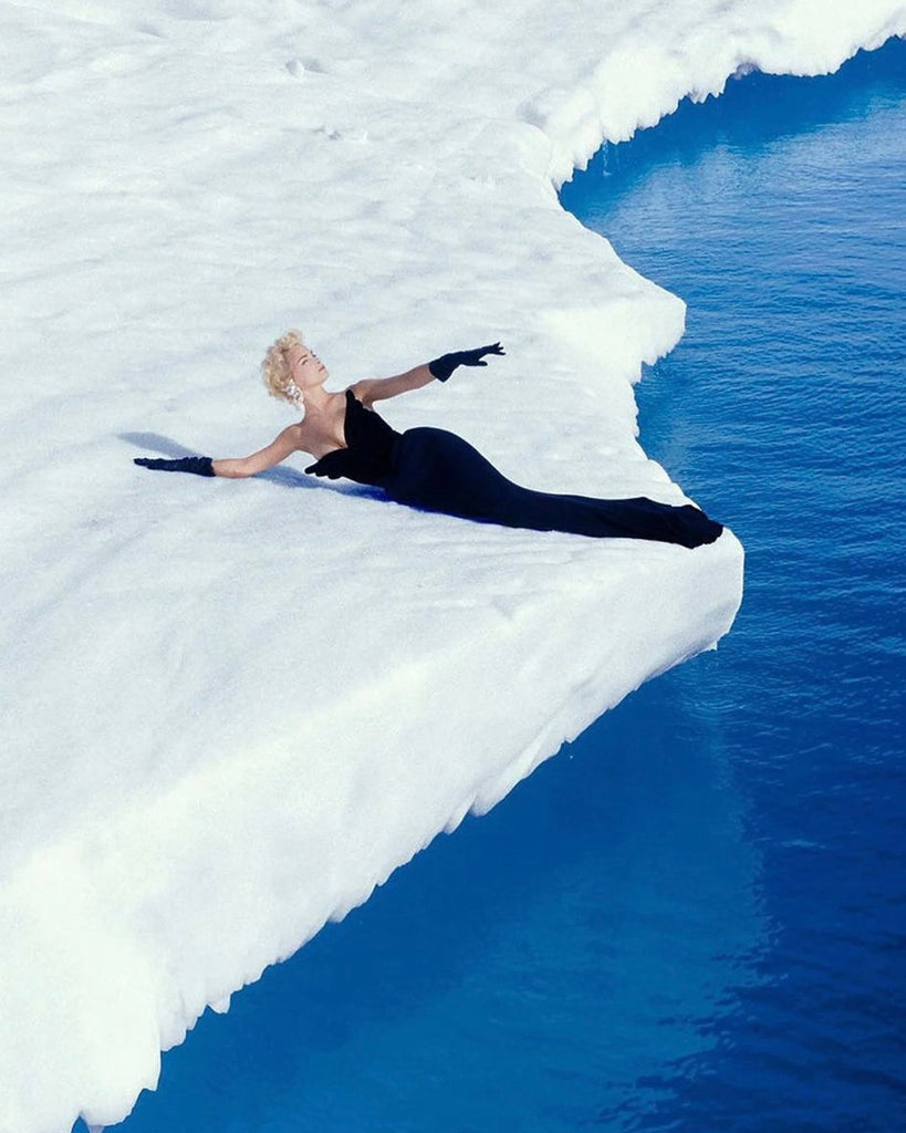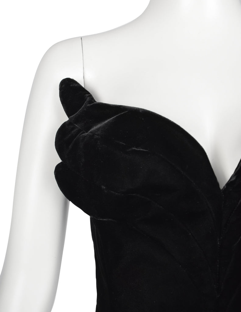 Incredible and iconic vintage Thierry Mugler ensemble from 1987, the bustier shown here documented in the legendary iceberg photoshoot shot by Manfred himself. The closet you'll get to recreating this epic look, this set comes with both the bustier and a skirt. The phenomenal winged bustier comes in a luxe black velvet, with stitched detailing at bust and wire through the wings to allow you to structure and style the piece as you prefer. Boning within, with a pointed bottom front. Slim backside has hook and eye closure. Fully lined in satin. Sheer, semi see through layered silk crepe skirt with asymmetric hem and snap closure. Wear them together or on their own to maximize their potential within your wardrobe.