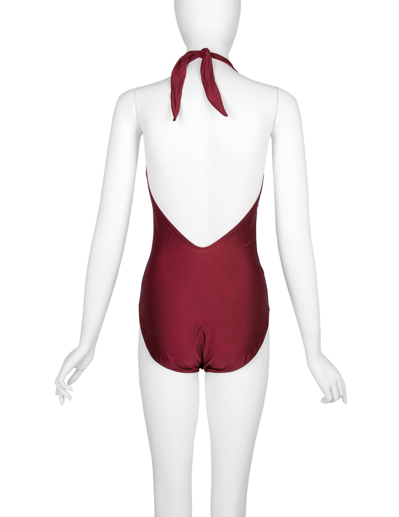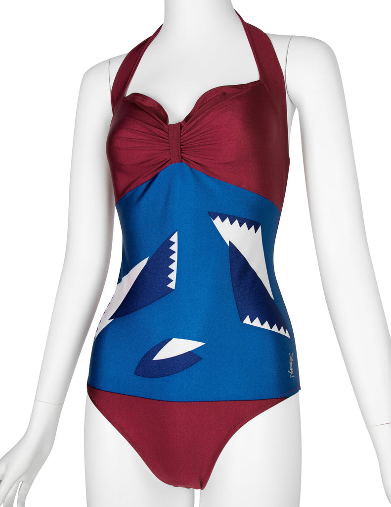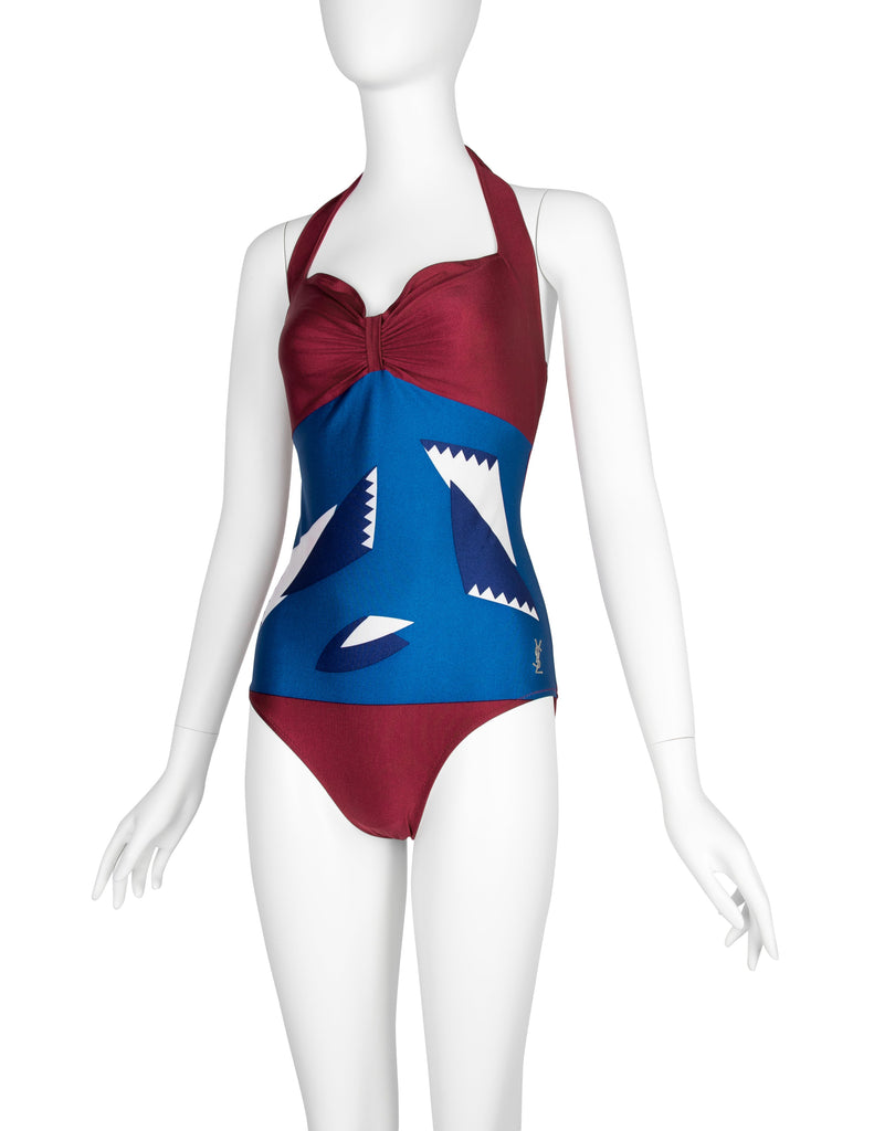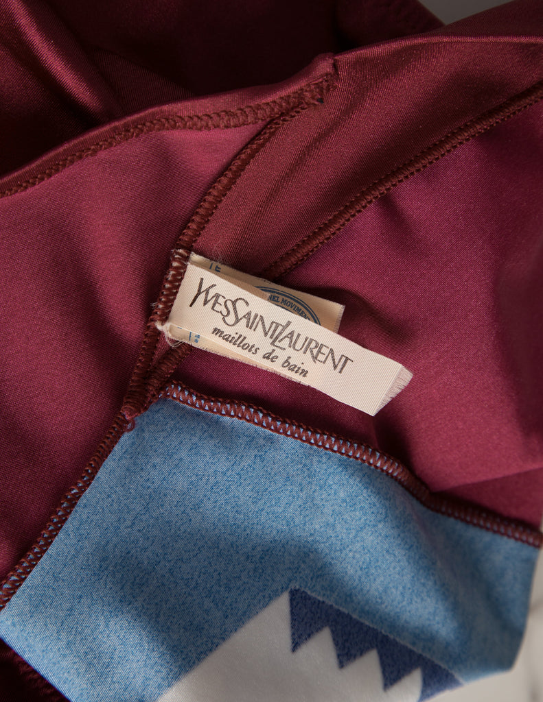 In love with this late 1970s vintage swimsuit by Yves Saint Laurent. Burgundy lycra with bold geometric print in shades of blue and white at the center, and embroidered golden YSL logo at the hip. Cutest little gather at the center of the bust. Wide halter straps tie at the back of the neck. A rare beauty.