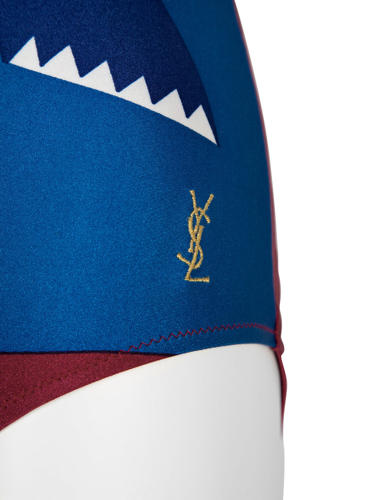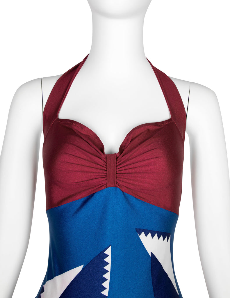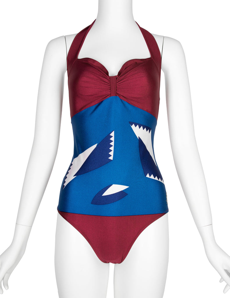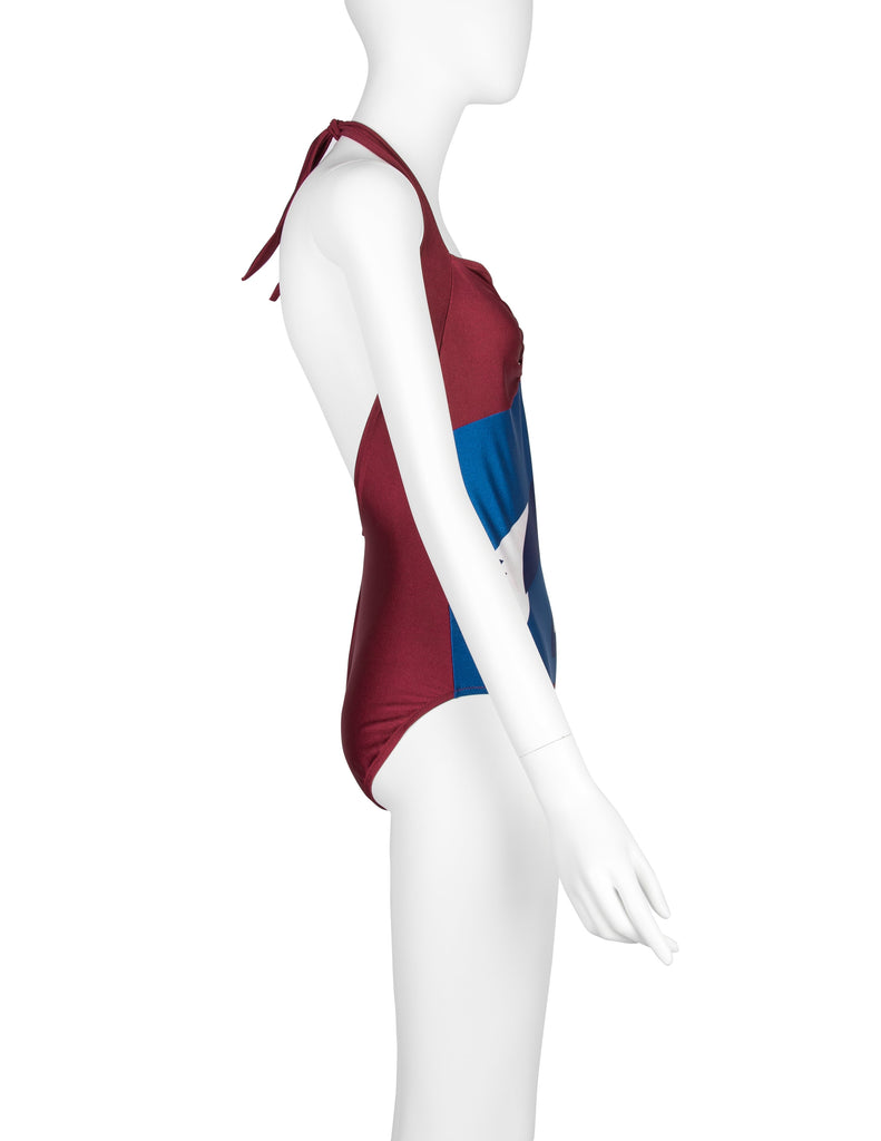 In love with this late 1970s vintage swimsuit by Yves Saint Laurent. Burgundy lycra with bold geometric print in shades of blue and white at the center, and embroidered golden YSL logo at the hip. Cutest little gather at the center of the bust. Wide halter straps tie at the back of the neck. A rare beauty.