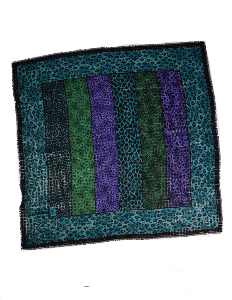 Yves Saint Laurent Vintage 1980s Purple Teal Green Black Leopard Print Golden Lurex Large Wool Pashmina Shawl Scarf