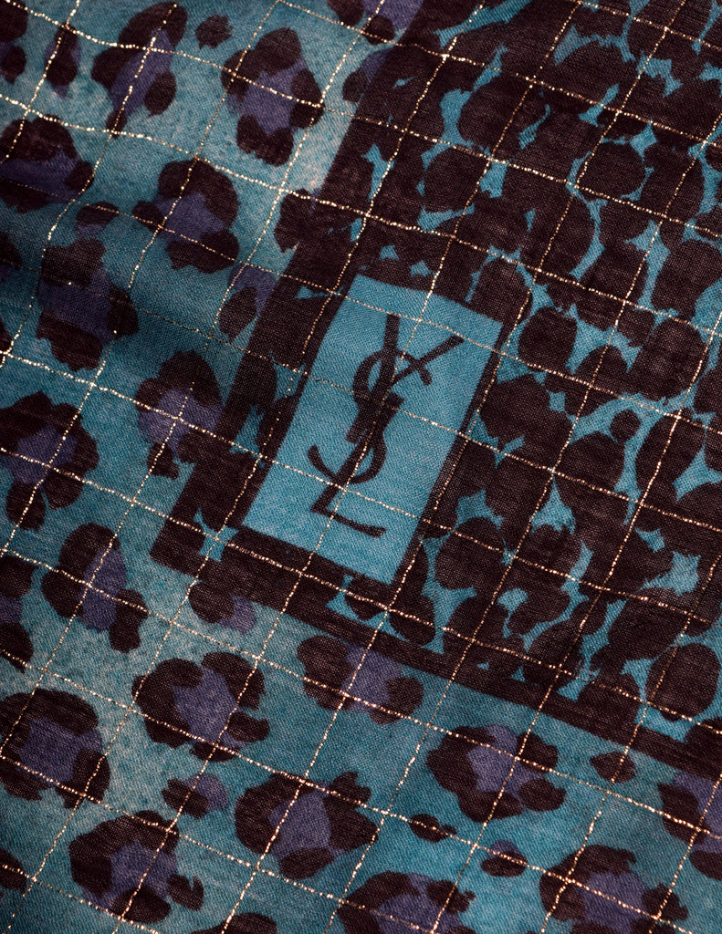 Gorgeous vintage Yves Saint Laurent scarf, circa mid 1980s. This huge, woven, soft wool scarf is shawl/pashmina size and can be styled in a variety of ways. Striking, killer color palette of teal, green, purple, and black, featuring varying leopard and cheetah prints. Sparkly golden lurex stripes throughout. Fringed, raw edge. YSL logo at corner.
