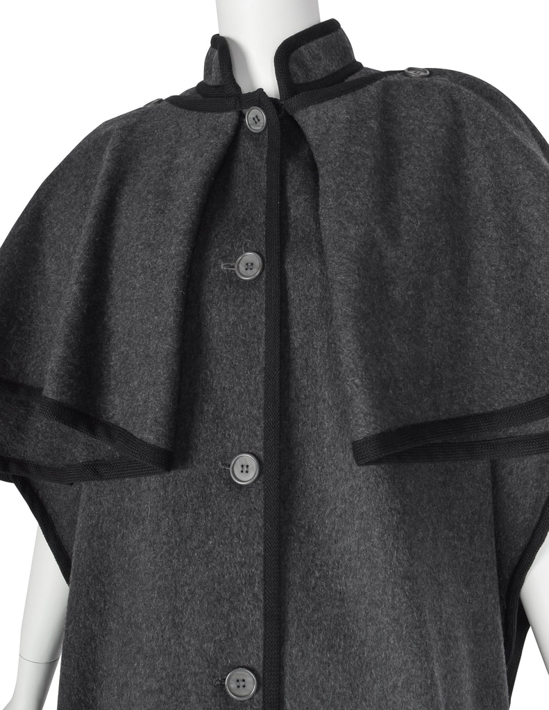 Gorgeous and rare vintage Yves Saint Laurent cape from Fall/Winter 1982, shown here documented on the runway. Soft charcoal grey wool, trimmed in black throughout. Wide cut, with a button at each side, creating an arm passage. Button closure at front. Amazing capelet layer that drapes beautifully, with a button at each shoulder that allows you to adjust the styling. Unlined.