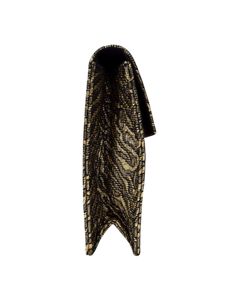 Beautiful vintage handbag by Yves Saint Laurent, from Fall/Winter 1986. Gorgeous blackened gold lurex fabric that shimmers and shines. Quilted/stitched effect resembling animal print or faux bois. Trapezoidal shape with a magnetic snap closure under the flap. Fully lined in black satin, with two inner pockets. Fits any size iPhone.