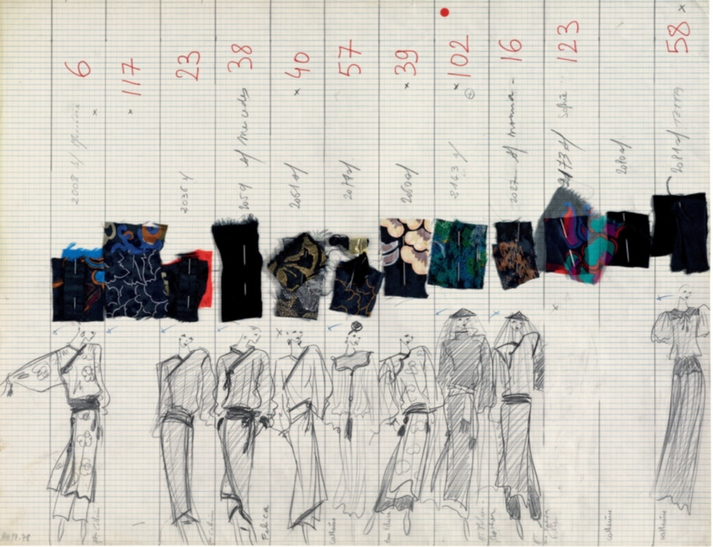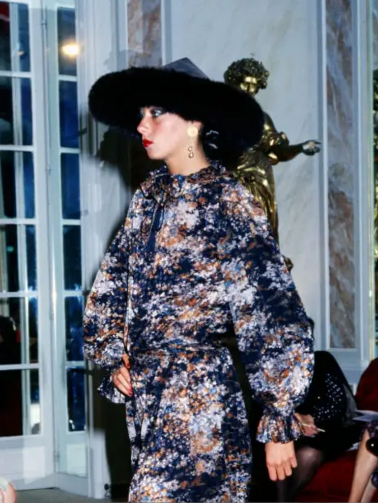 Rare, outstanding vintage Yves Saint Laurent Haute Couture blouse from the Fall/Winter 1977 'Les Chinoises' collection, the print shown here documented on the runway in another color.