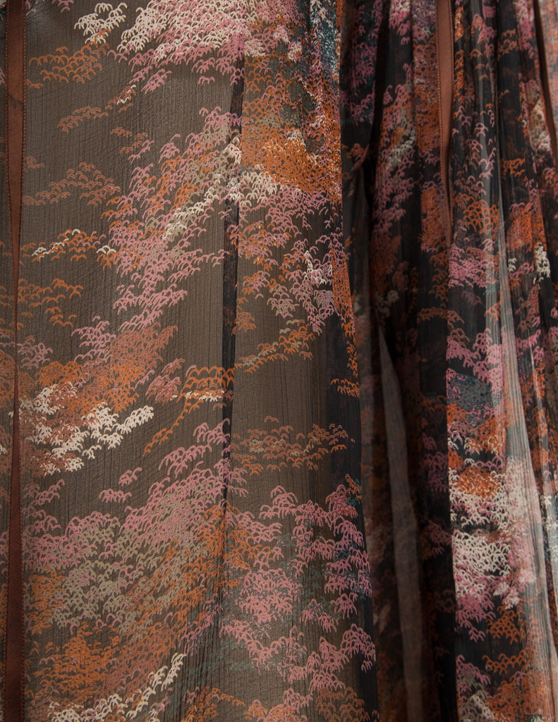 • Stunning foliage print sheer silk georgette in shades of brown, orange, teal, pink, and more.